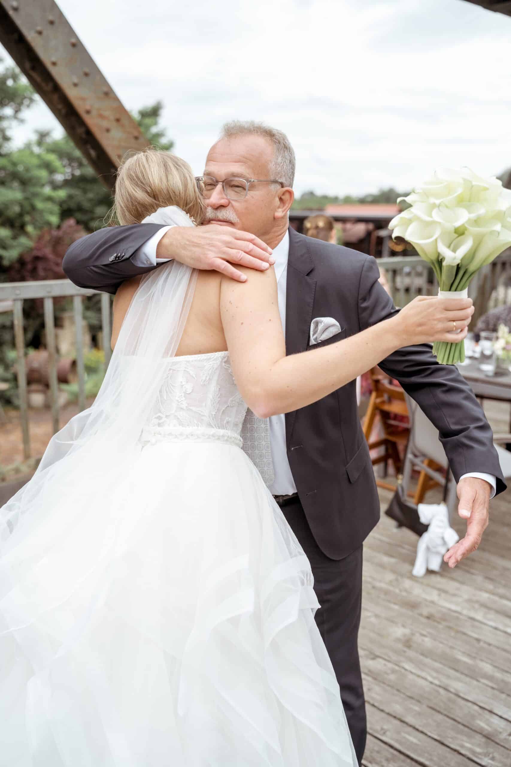 Nach dem Ja-Wort ging es für den Sektempfang und Kaffee und Kuchen hoch hinaus auf die alte Eisenbahnbrücke. Das ist das absolute Highlight dieser Location. Man steht über den Dingen genießt die Aussicht und die Atmosphäre ist sofort locker und entspannt.