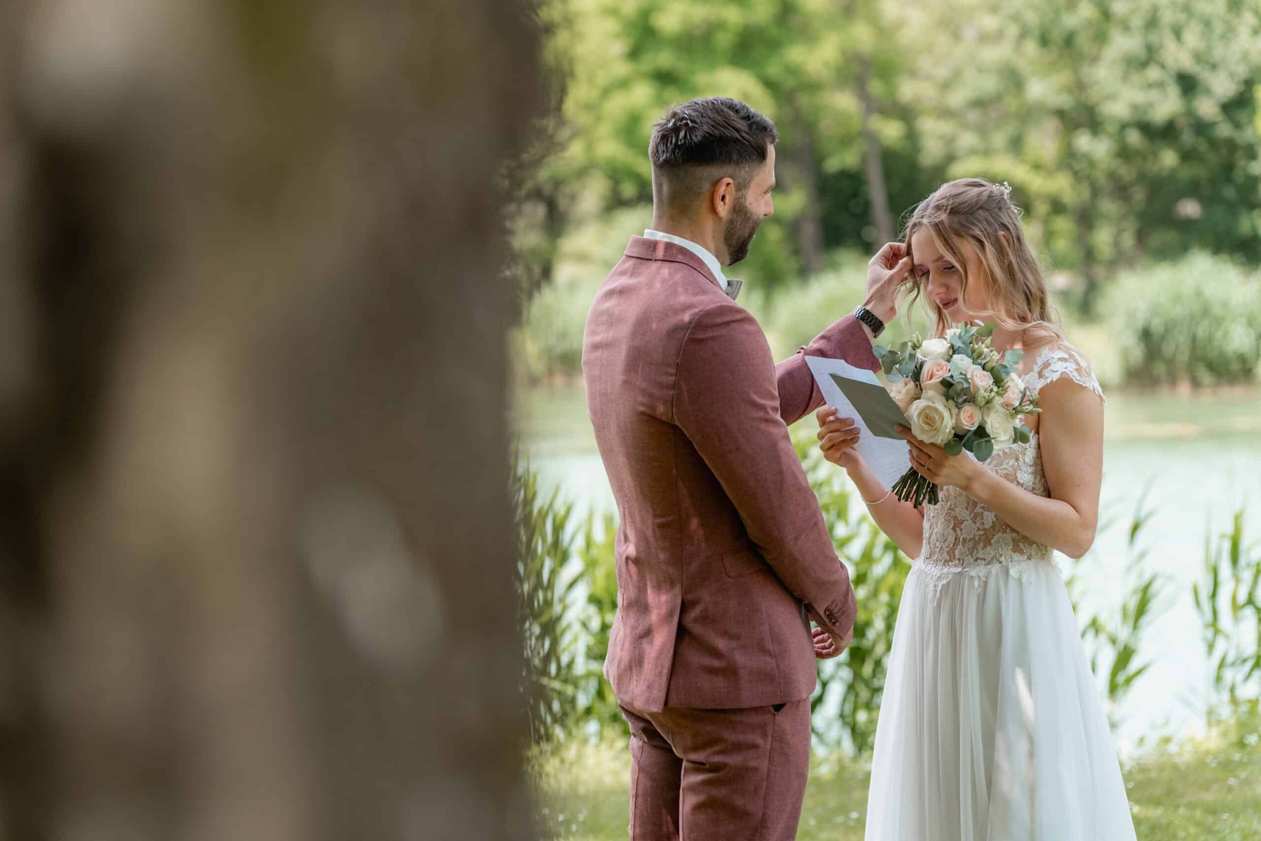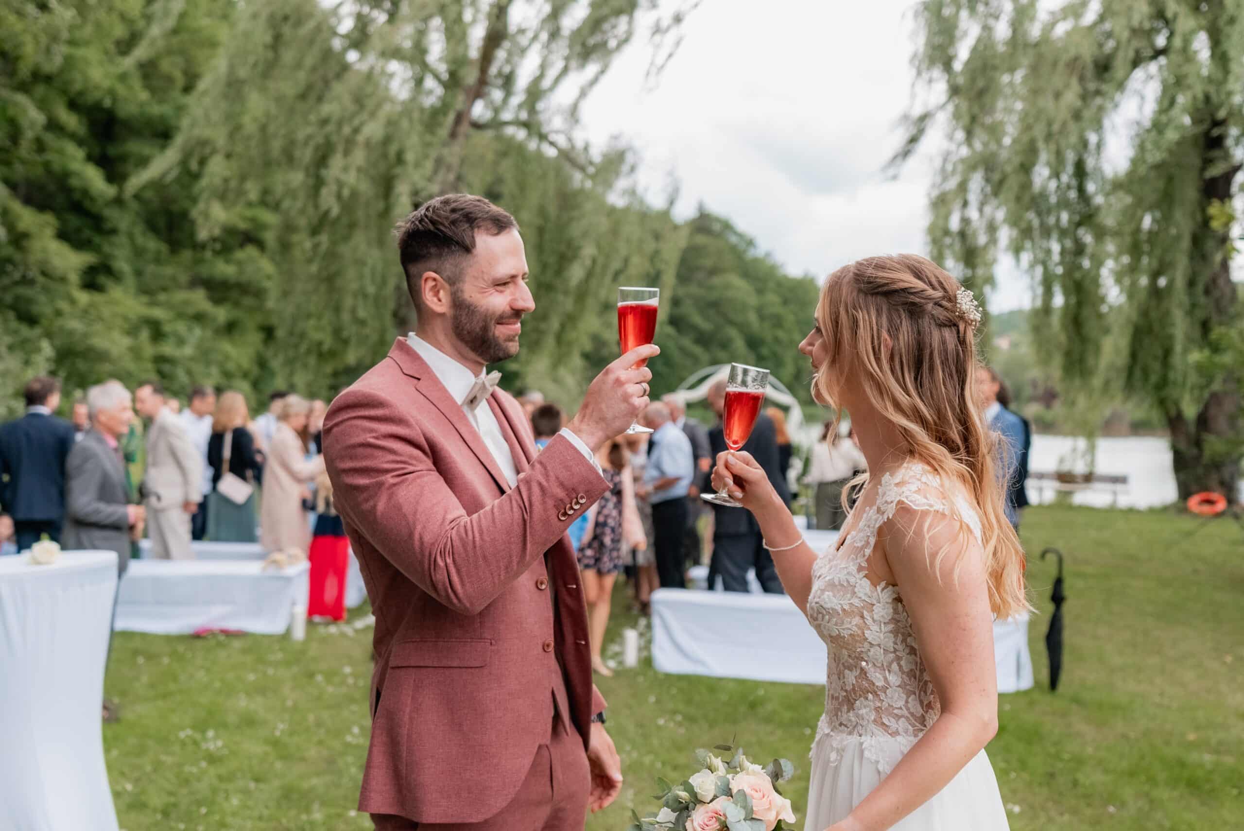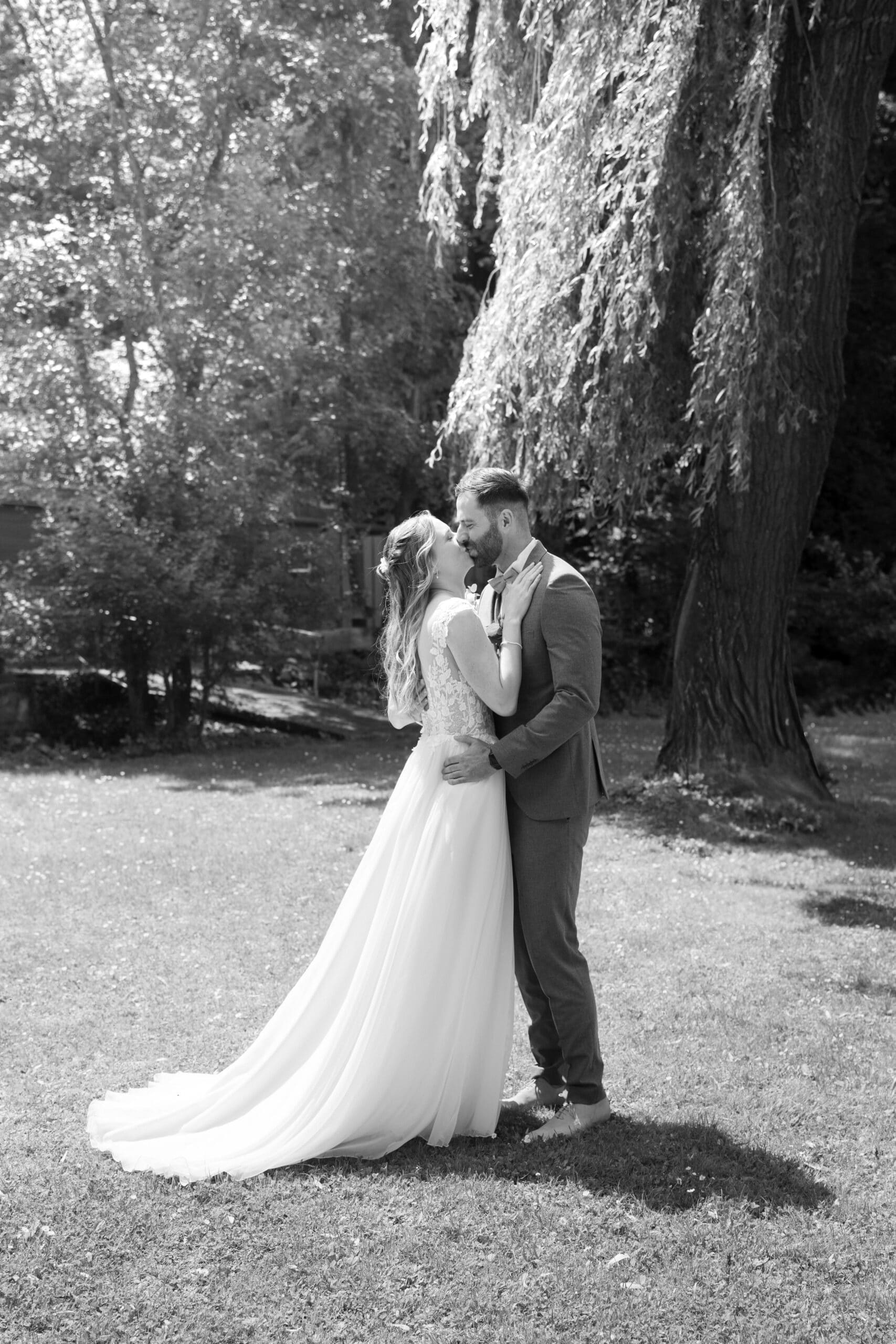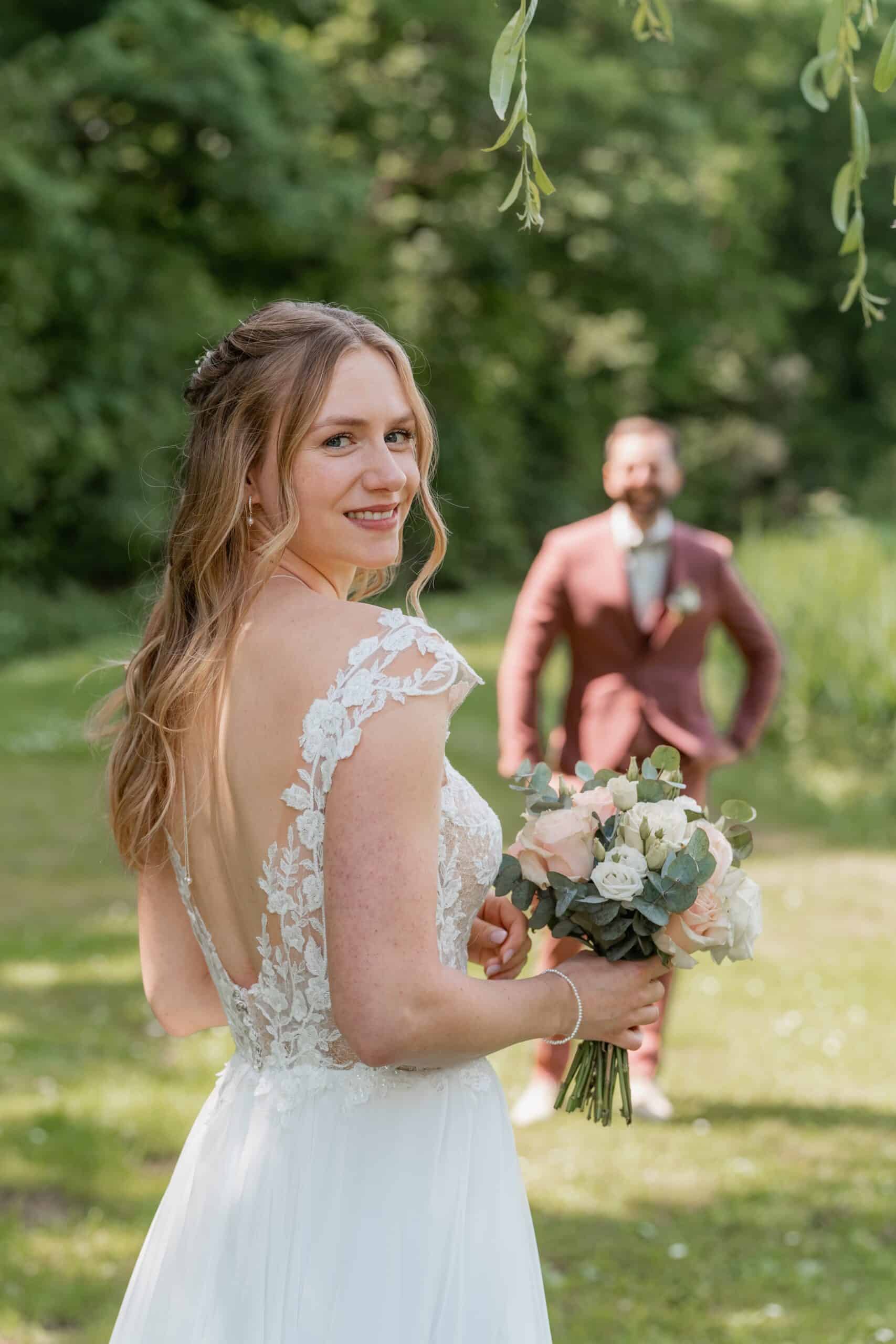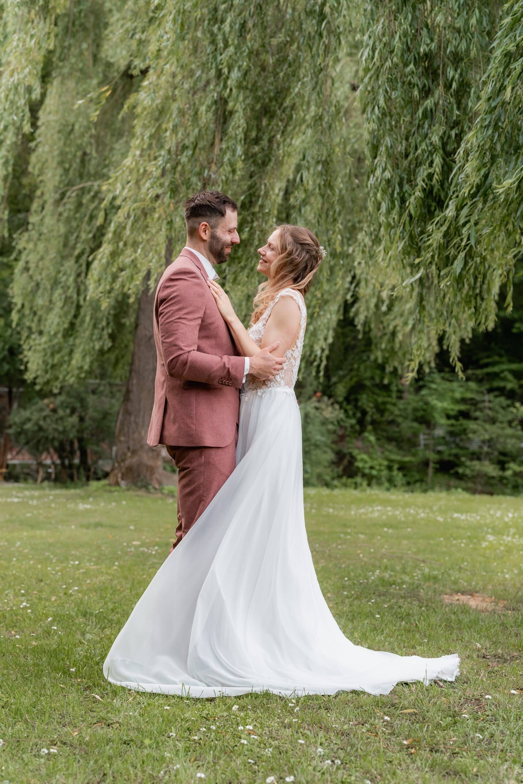 Der Tag begann mit einem emotionalen First Look direkt am See unter der großen Trauerweide. Abseits vom Trubel haben sich die beiden hier zum ersten Mal gesehen – ein Moment der ganz ihnen gehörte. Wir haben die Zeit direkt für ein Paarshooting genutzt bei dem natürliche Bilder entstanden sind. Ein Wechsel von Posing und natürlicher Dynamik, nur die beiden, das Licht und die Kulisse am Wasser.