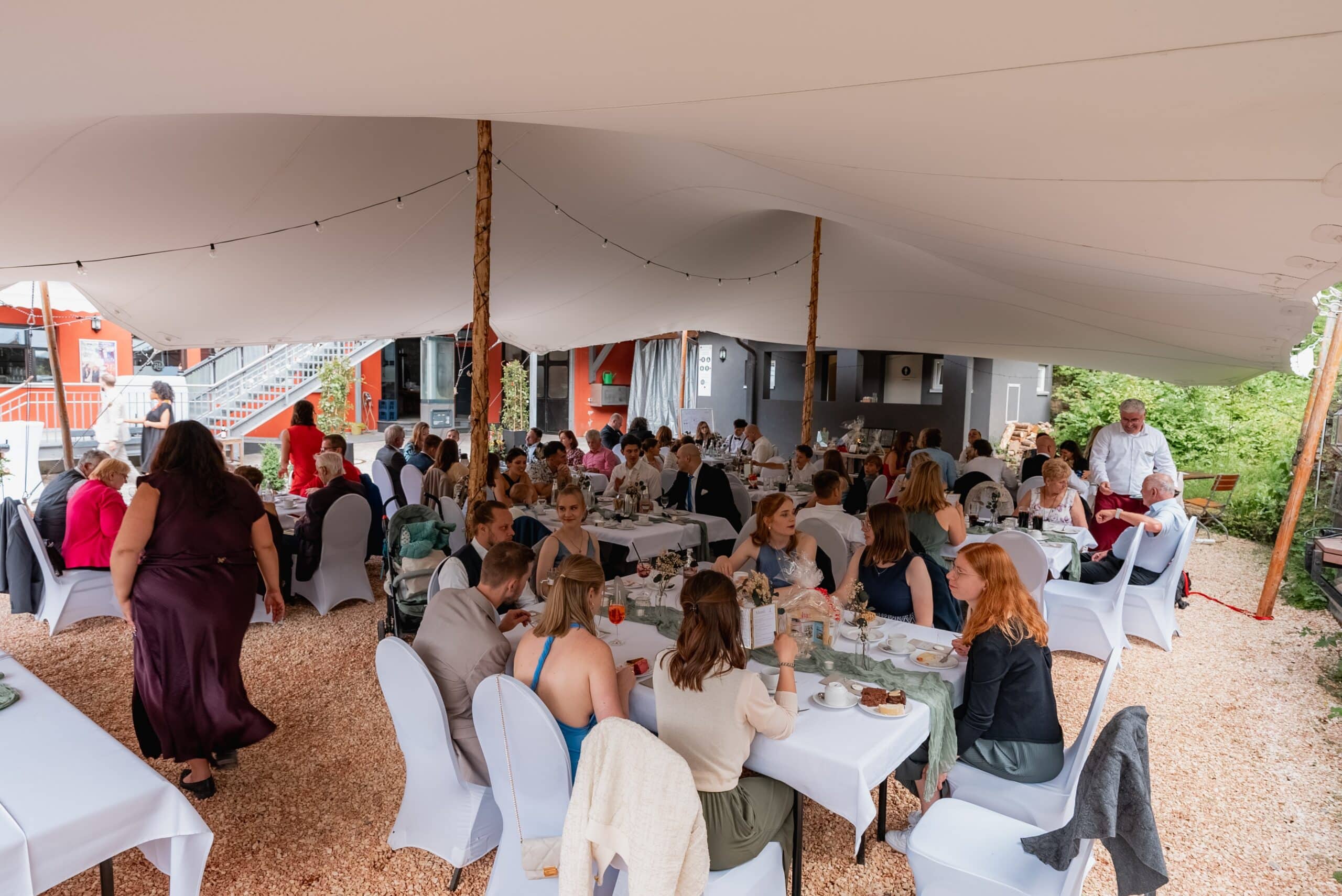 Gefeiert wurde anschließend auf dem Gelände von „Das Retz“. Vom Sektempfang über das Abendessen bis zum Tortenanschnitt fand alles in einer lockeren, fließenden Atmosphäre statt. Ein absolutes Highlight war das große Stretchzelt das dem Außenbereich am Abend einen fast festivalartigen, gemütlichen Charakter gab. Als nach dem Hochzeitstanz die Party startete war die Stimmung auf dem Höhepunkt.
