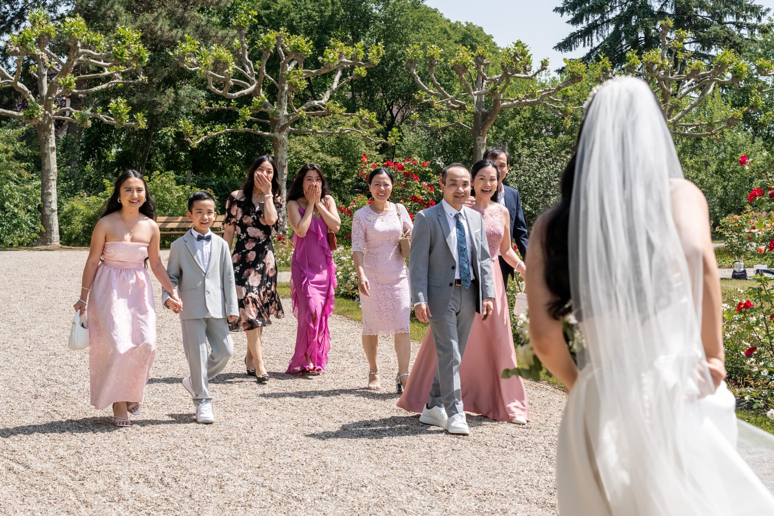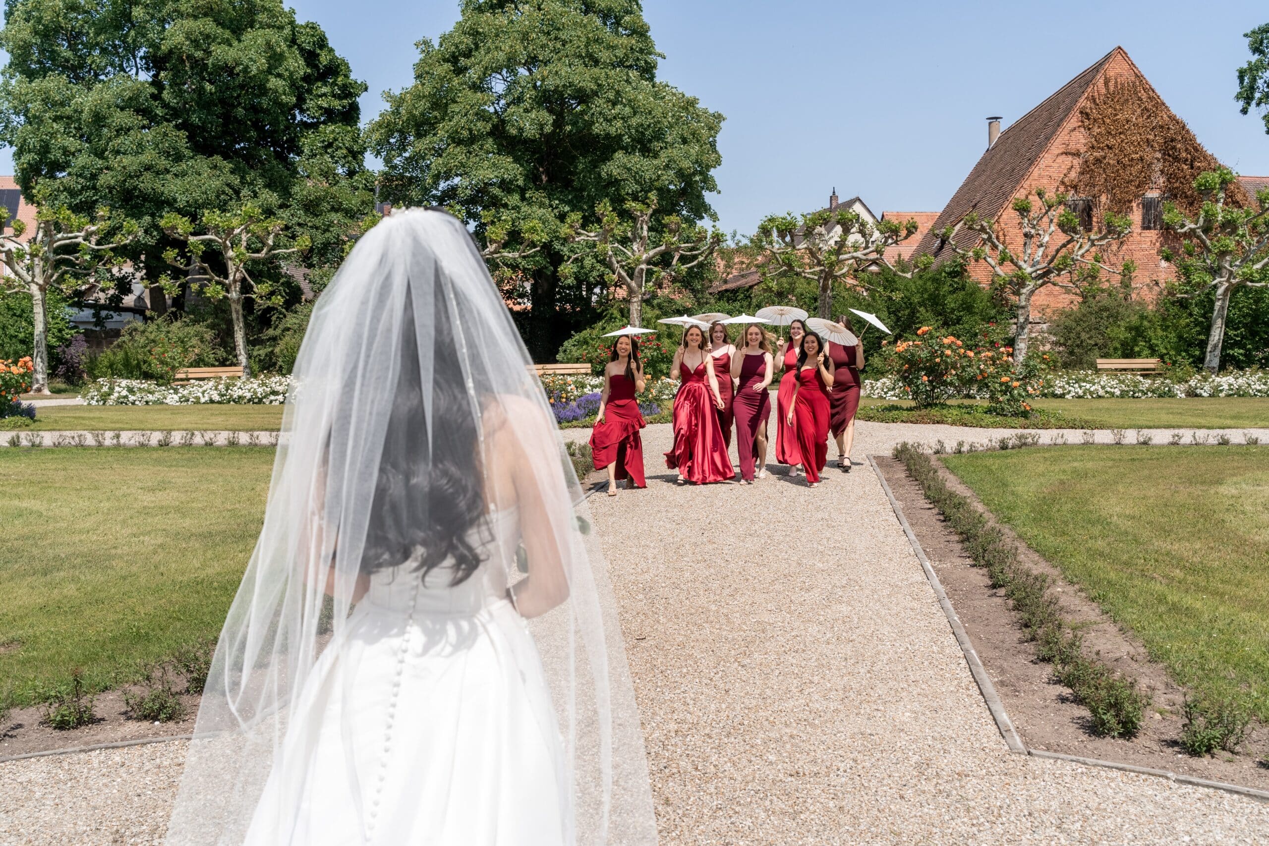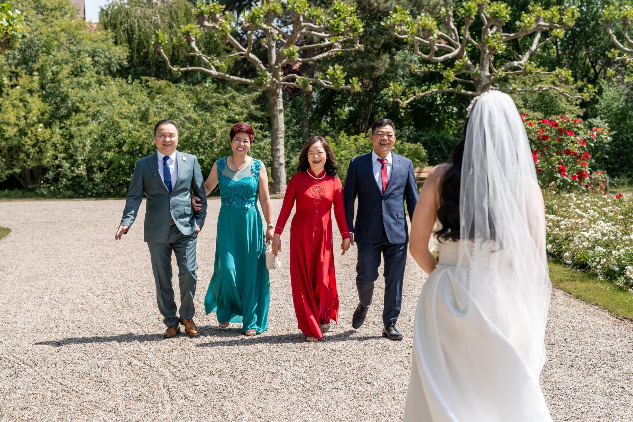 Von dort aus sind wir zum Schlossgarten von Schloss Neunhof gefahren. Dieser Ort bietet mit seiner barocken Gartenanlage eine fantastische Eleganz für editorial dokumentarische Hochzeitsfotos. Dort gab es dann einen zweiten, sehr emotionalen First Look – diesmal mit der Familie, die kurz nach dem Photoshooting eintraf.