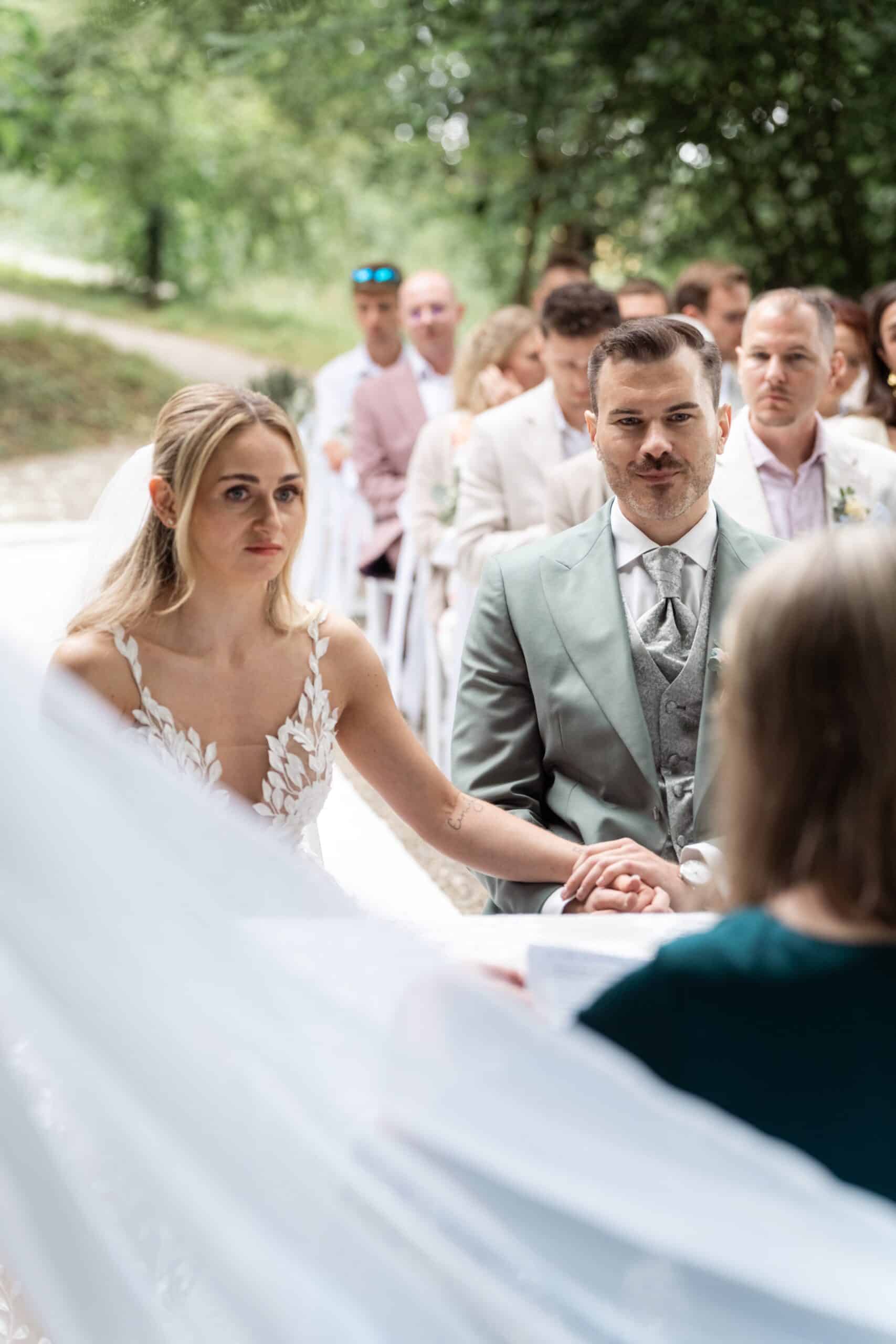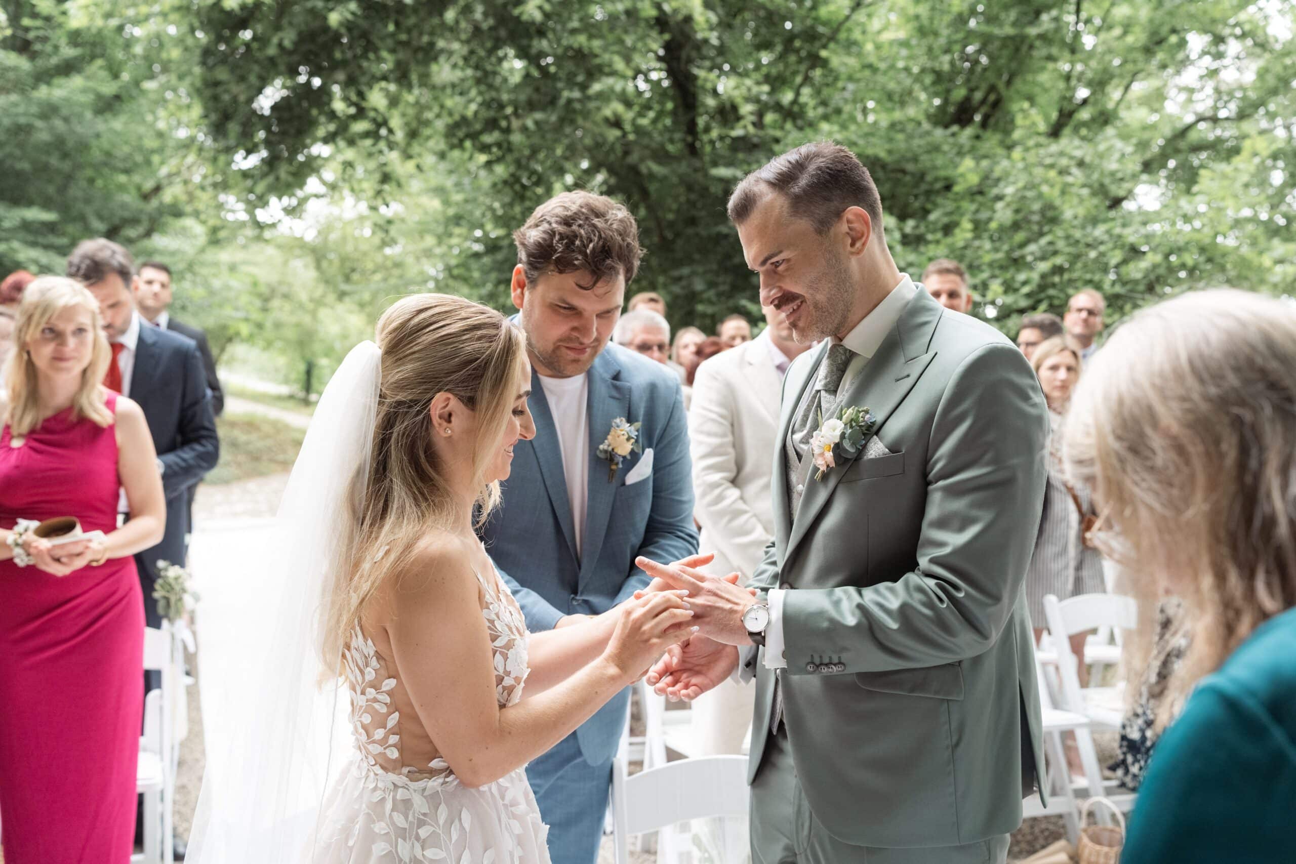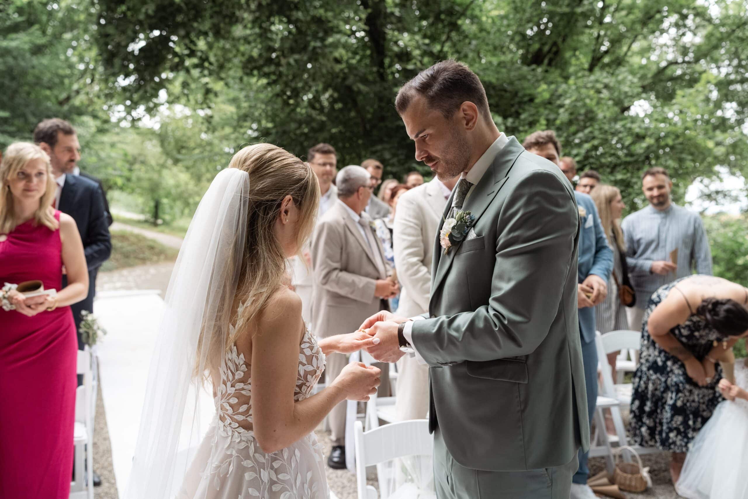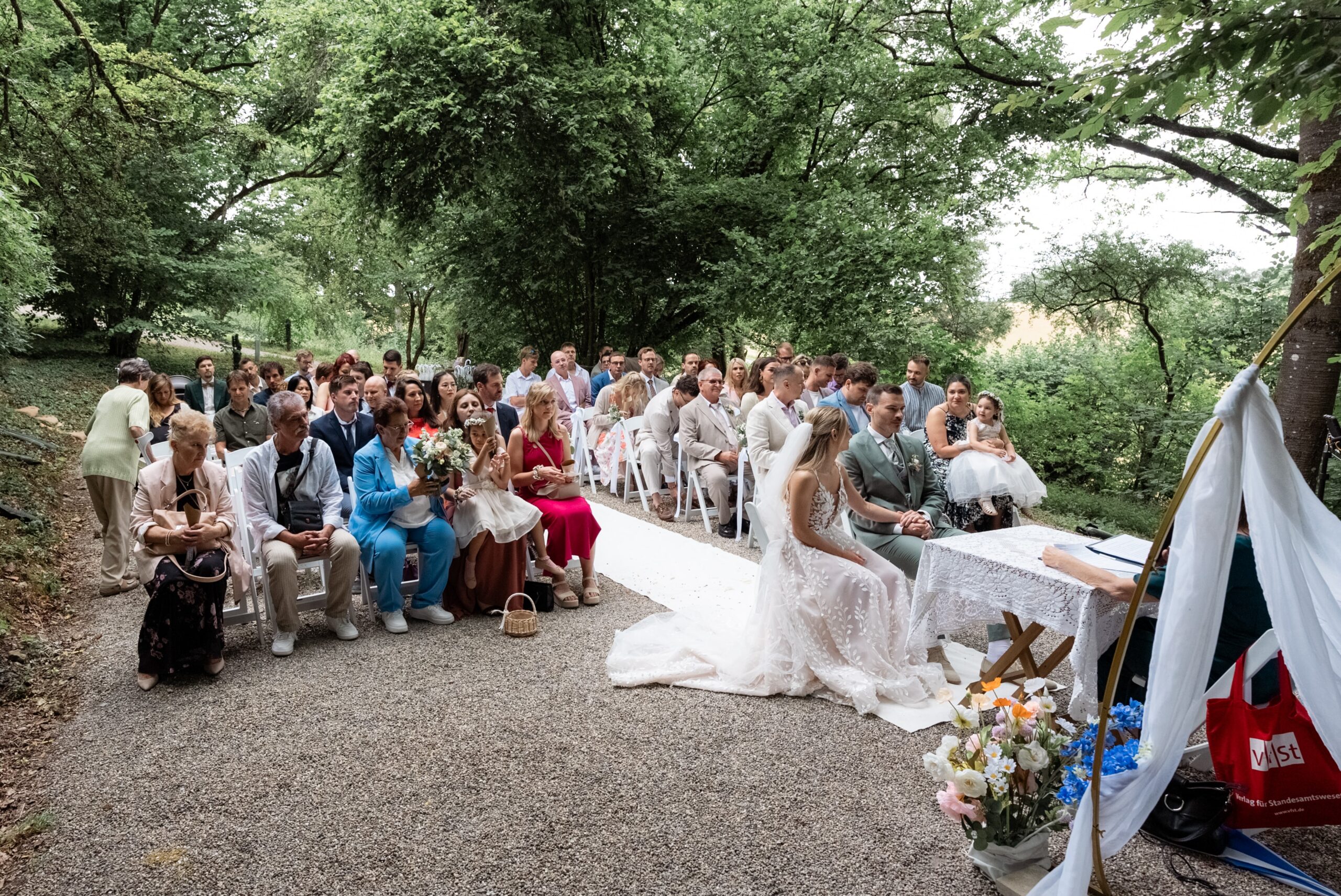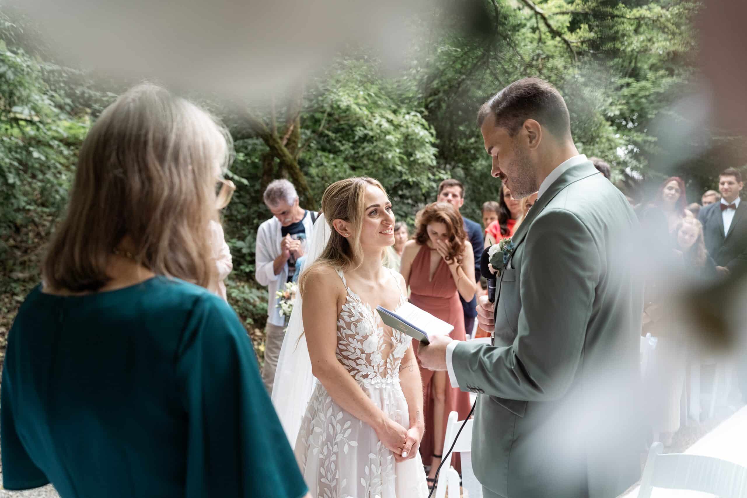 Der Tag startete mit dem Getting Ready der beiden vor Ort bevor es zum ersten großen Highlight ging. Die Villa bietet nämlich eine Besonderheit die man selten findet: Eine freie standesamtliche Trauung direkt auf einer Waldlichtung. Umgeben von hohen Bäumen und Natur gaben sich die beiden hier das Ja-Wort. Diese Mischung aus eleganter Villa und wilder Natur macht den Ort so spannend.