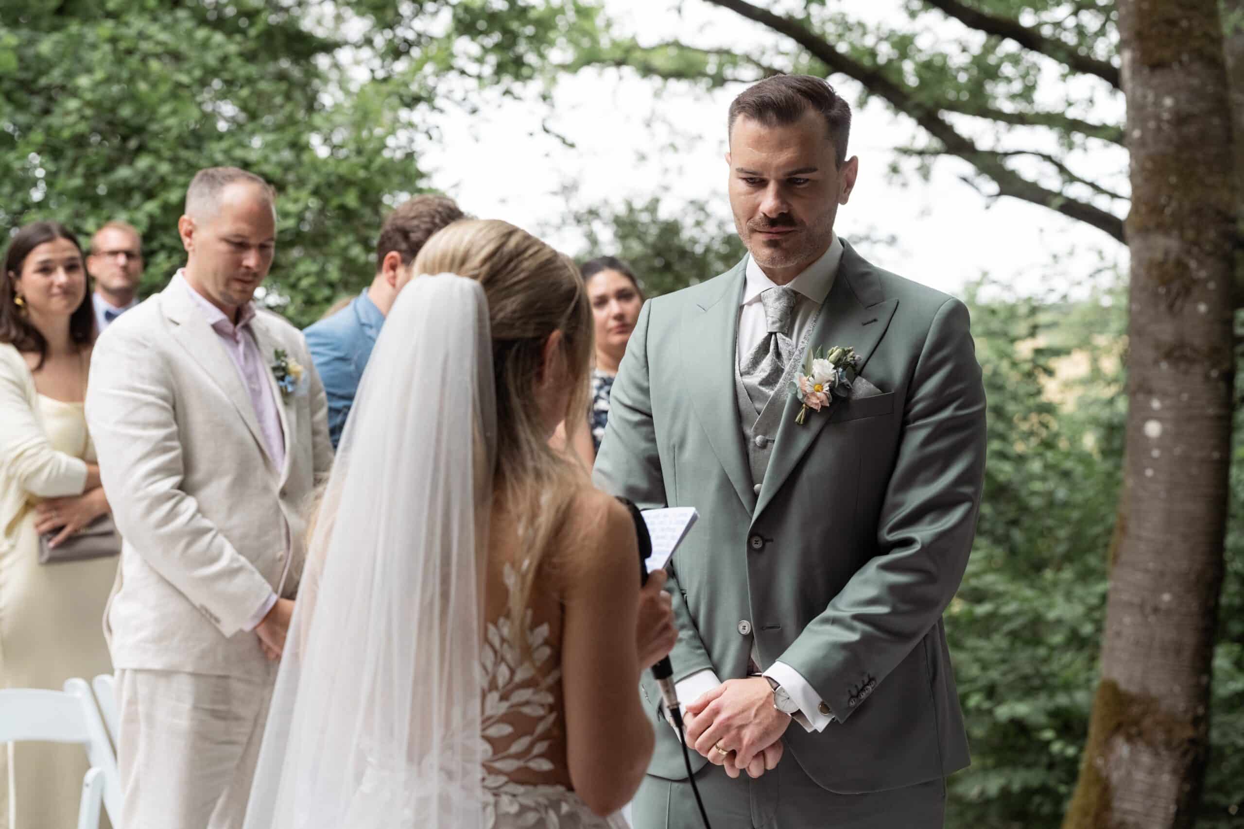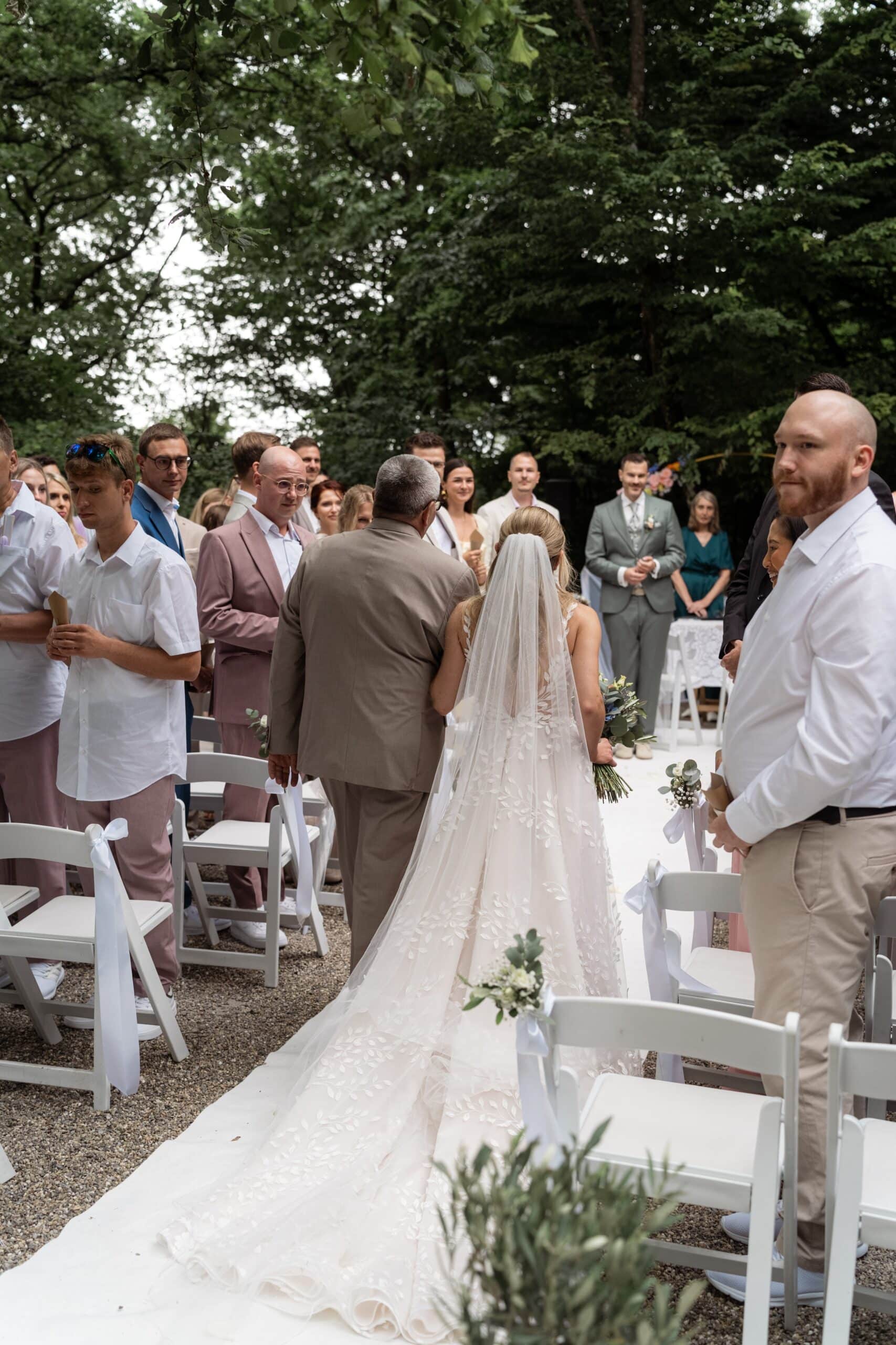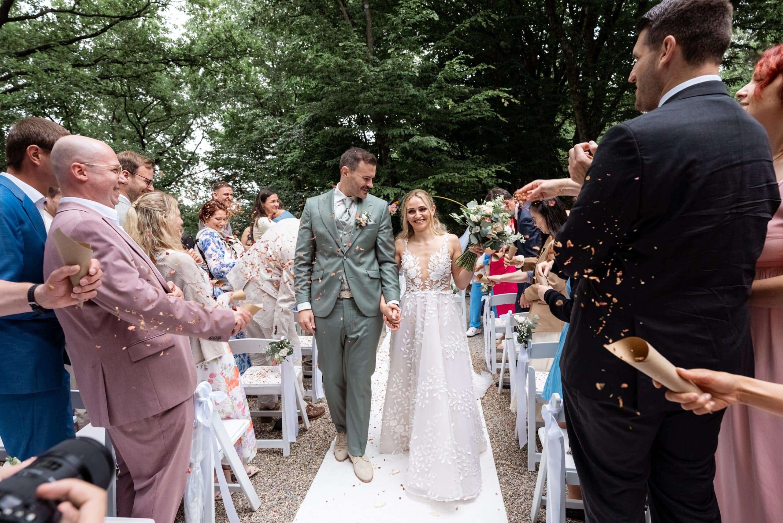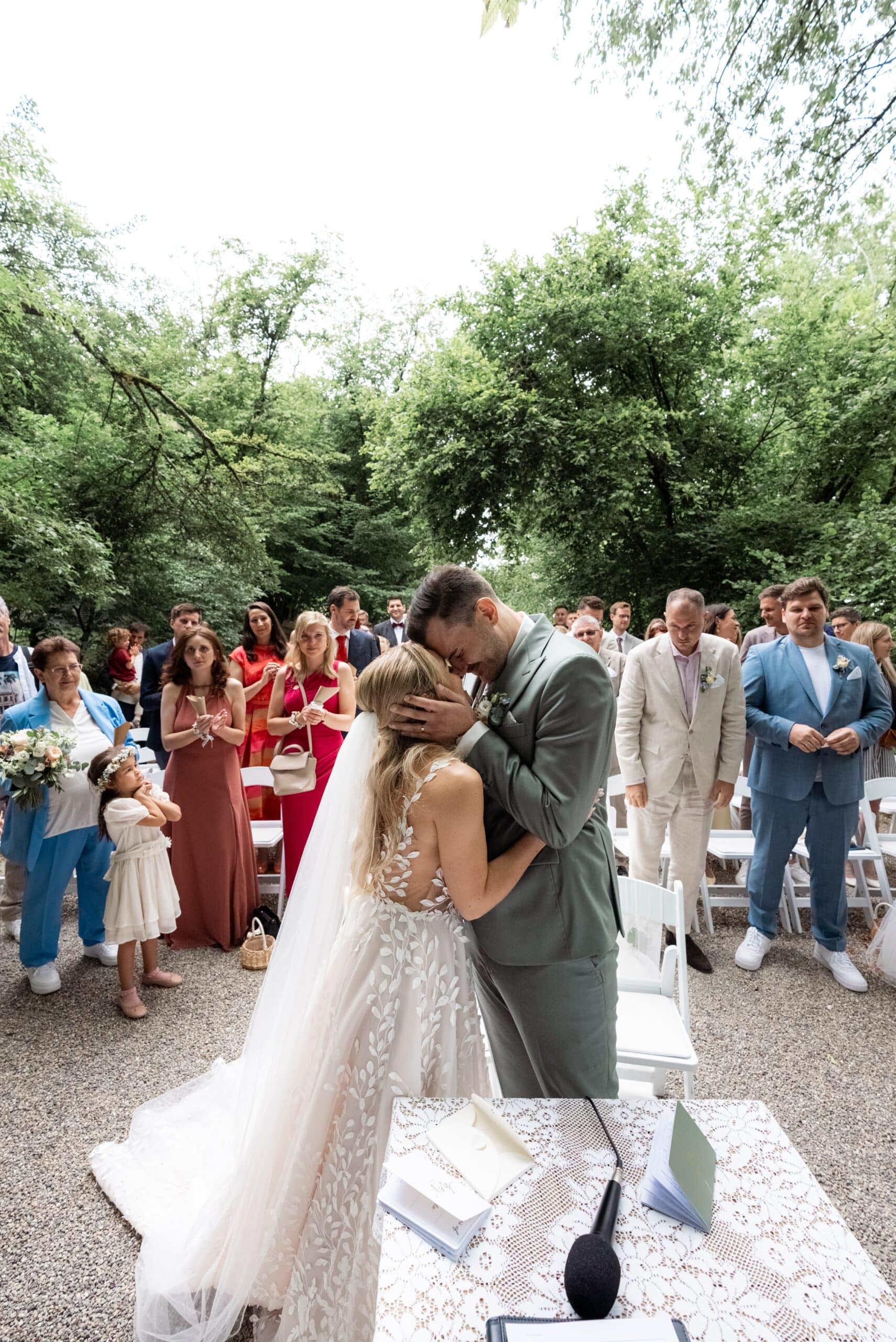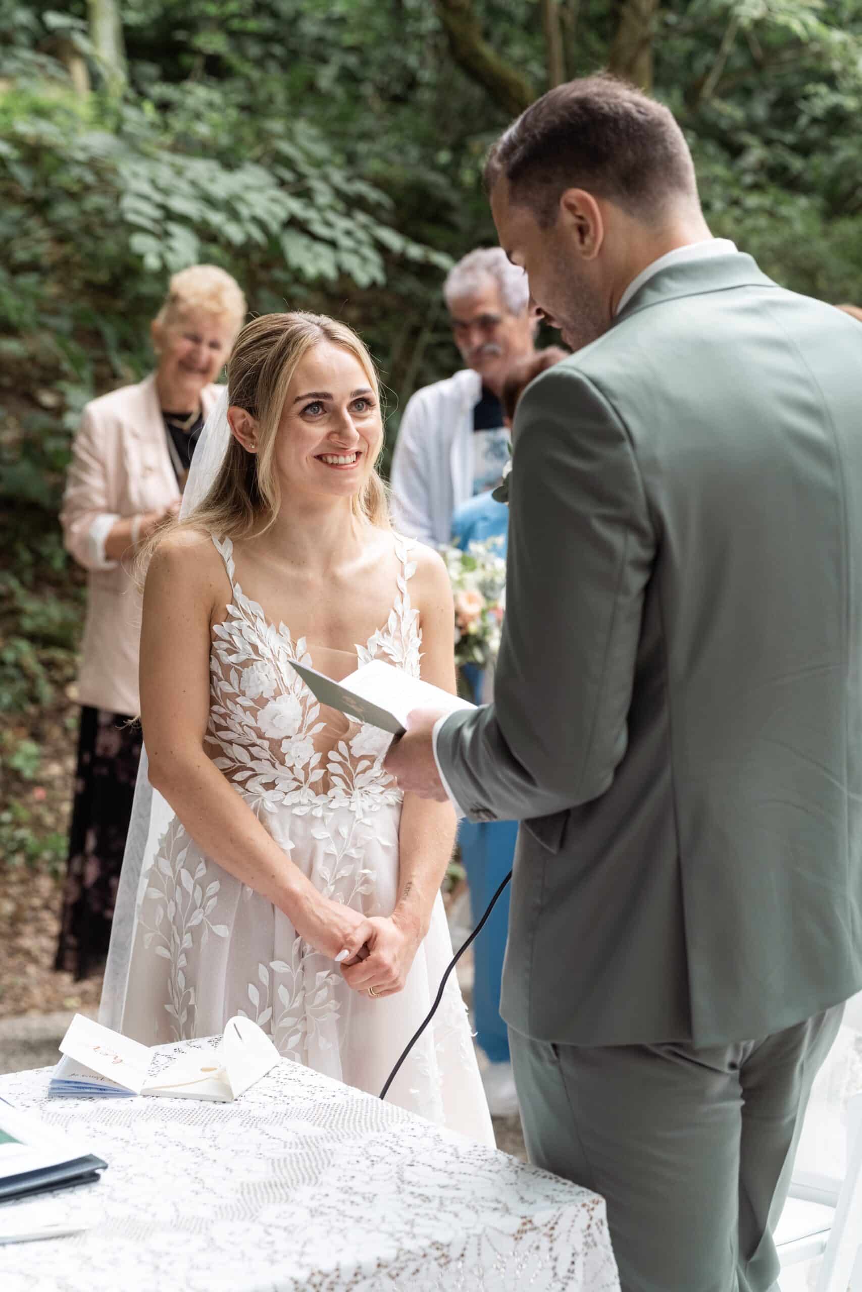 Der Tag startete mit dem Getting Ready der beiden vor Ort bevor es zum ersten großen Highlight ging. Die Villa bietet nämlich eine Besonderheit die man selten findet: Eine freie standesamtliche Trauung direkt auf einer Waldlichtung. Umgeben von hohen Bäumen und Natur gaben sich die beiden hier das Ja-Wort. Diese Mischung aus eleganter Villa und wilder Natur macht den Ort so spannend.