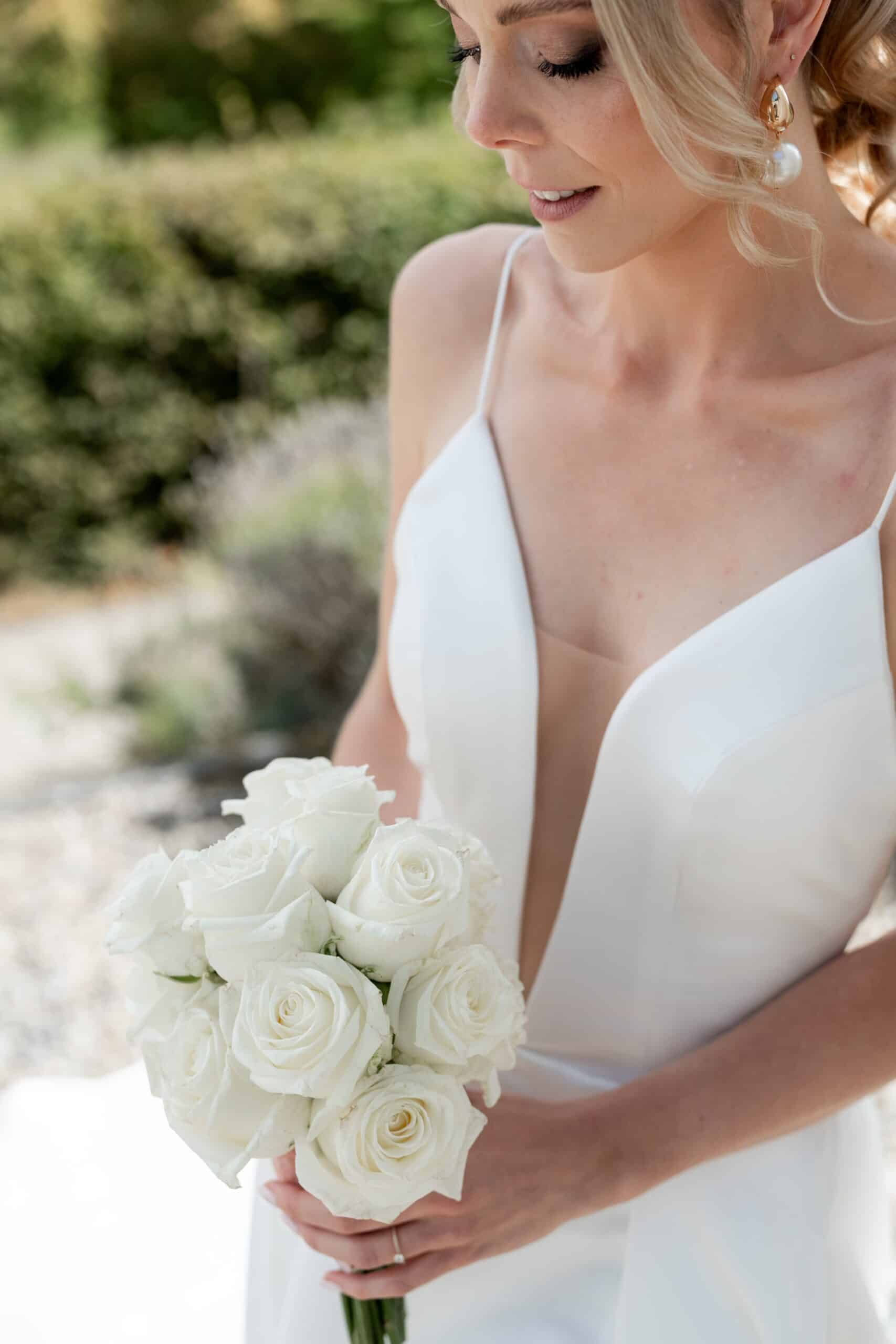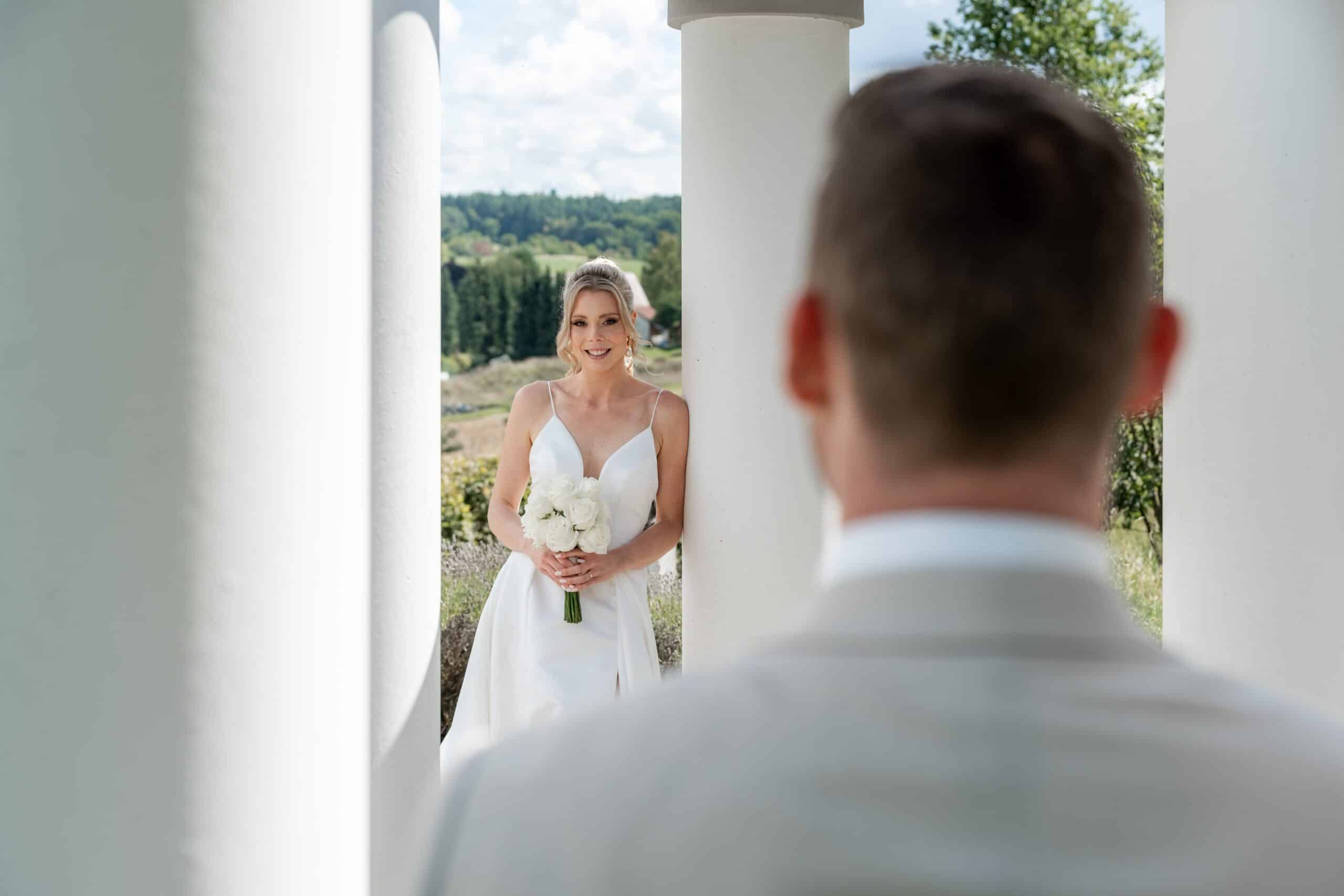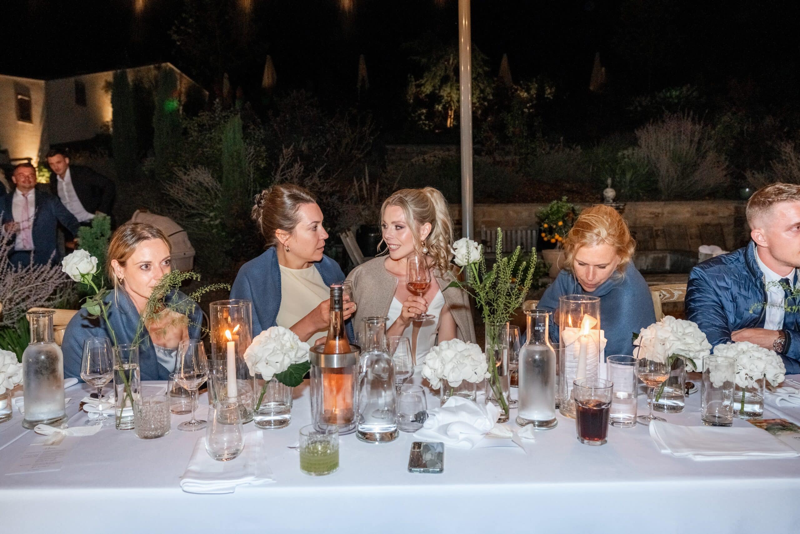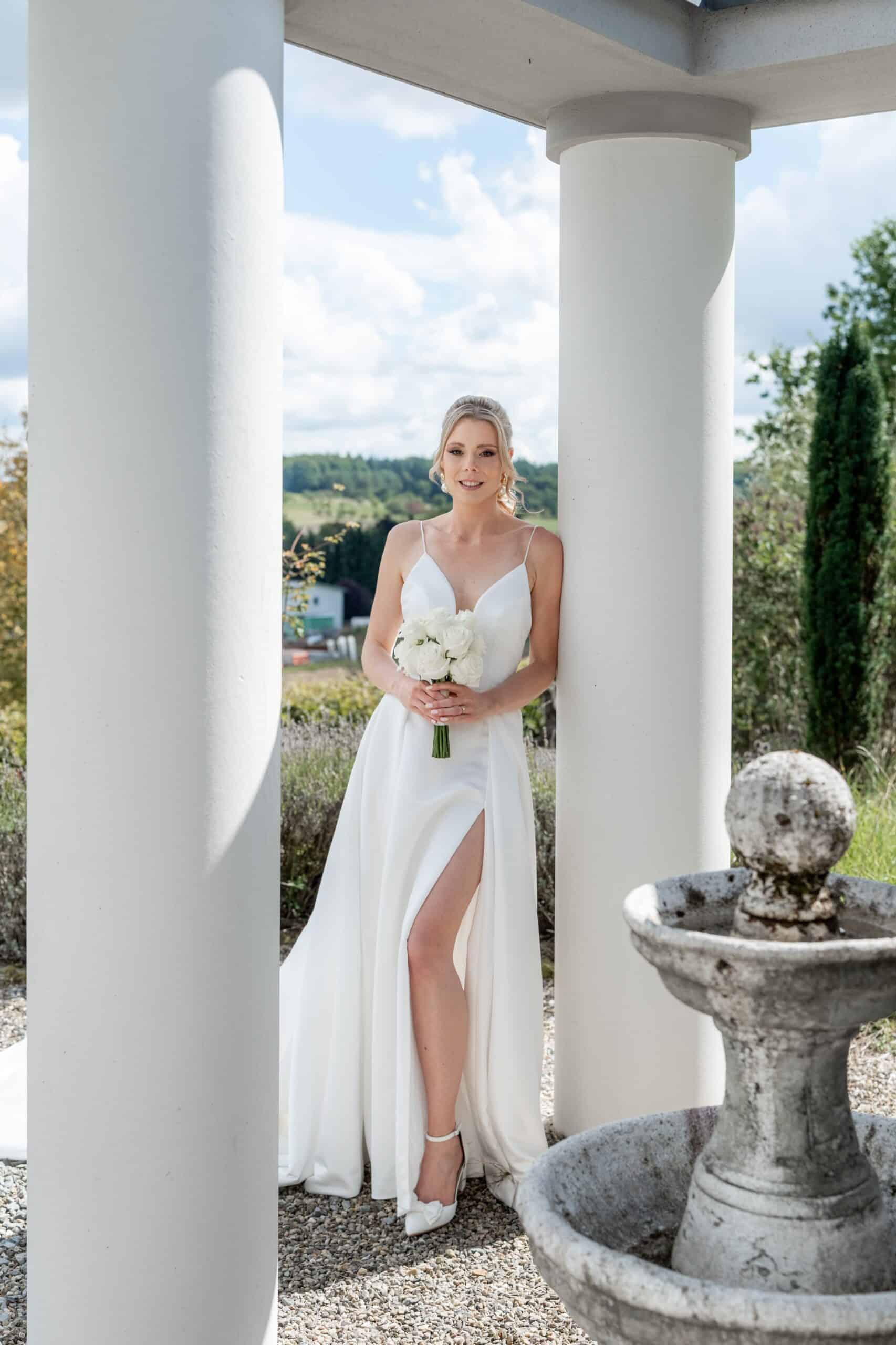 Die Villa mit ihren hellen Terrassen warmen Farben und dem offenen Garten passte perfekt zu ihrem Stil. Alles war in weichen Weißtönen gehalten von den Blumen über die Tischdekoration bis zu Pias modernem Kleid das im warmen Licht wunderschön zur Geltung kam. Dazu kam ein klarer moderner Editorial Look der dem Tag eine besondere Ästhetik gegeben hat ohne künstlich oder gestellt zu wirken.