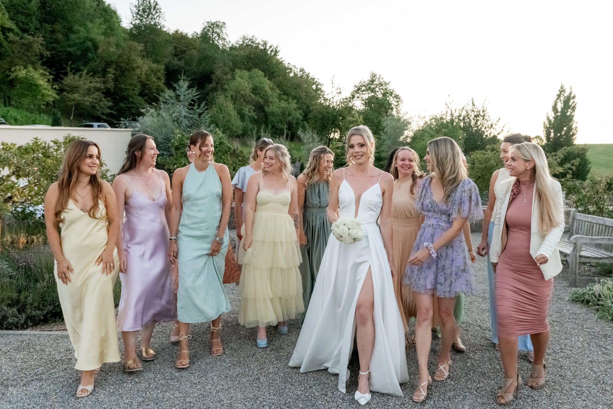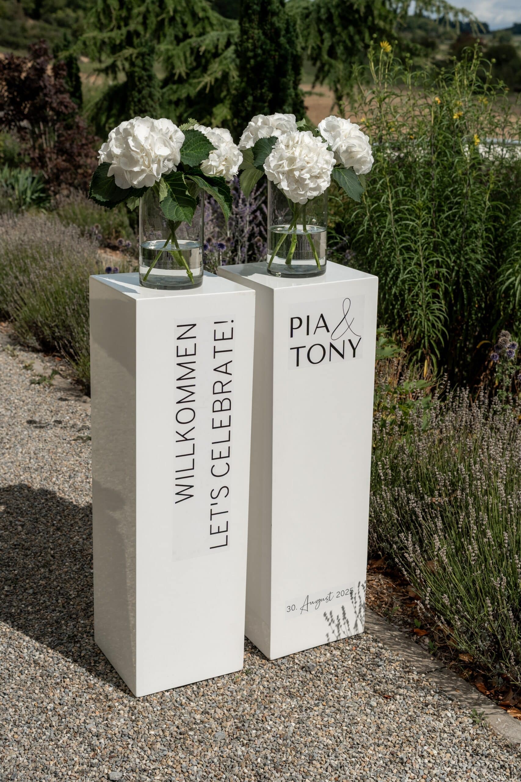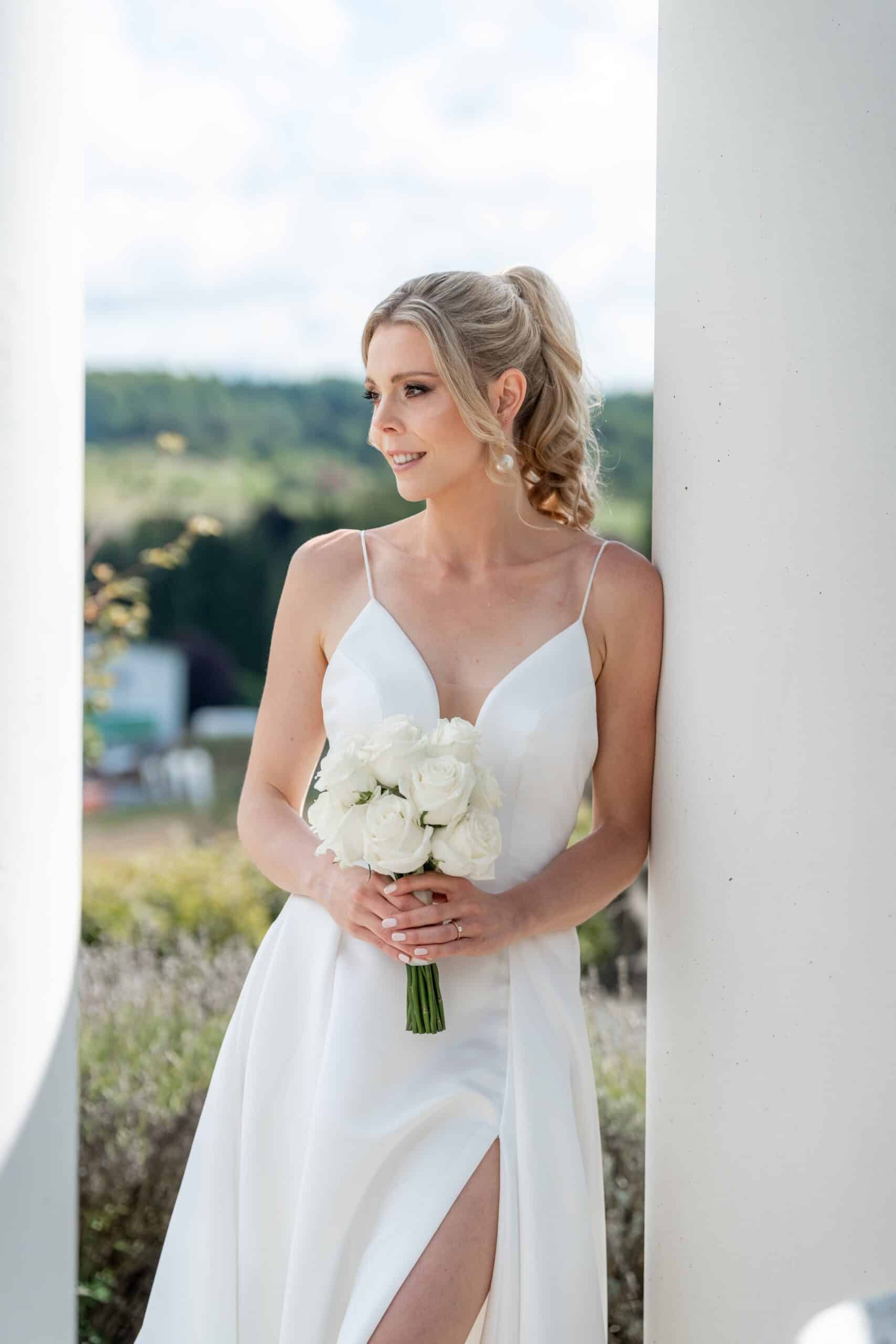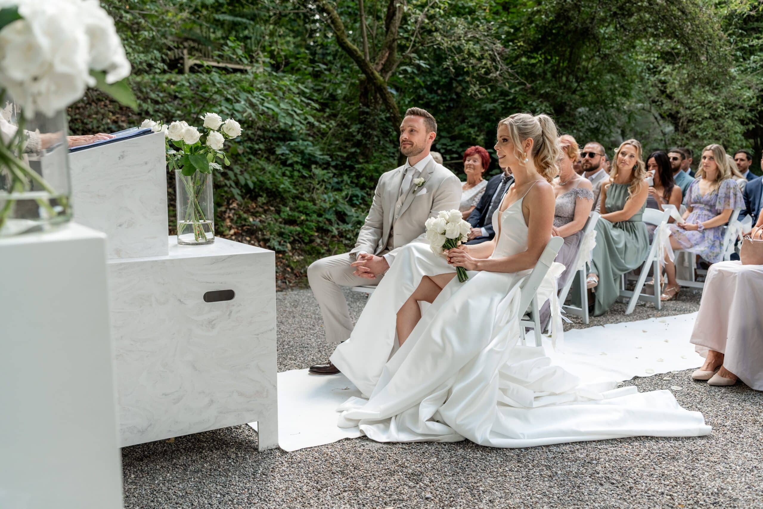 Die Villa mit ihren hellen Terrassen warmen Farben und dem offenen Garten passte perfekt zu ihrem Stil. Alles war in weichen Weißtönen gehalten von den Blumen über die Tischdekoration bis zu Pias modernem Kleid das im warmen Licht wunderschön zur Geltung kam. Dazu kam ein klarer moderner Editorial Look der dem Tag eine besondere Ästhetik gegeben hat ohne künstlich oder gestellt zu wirken.