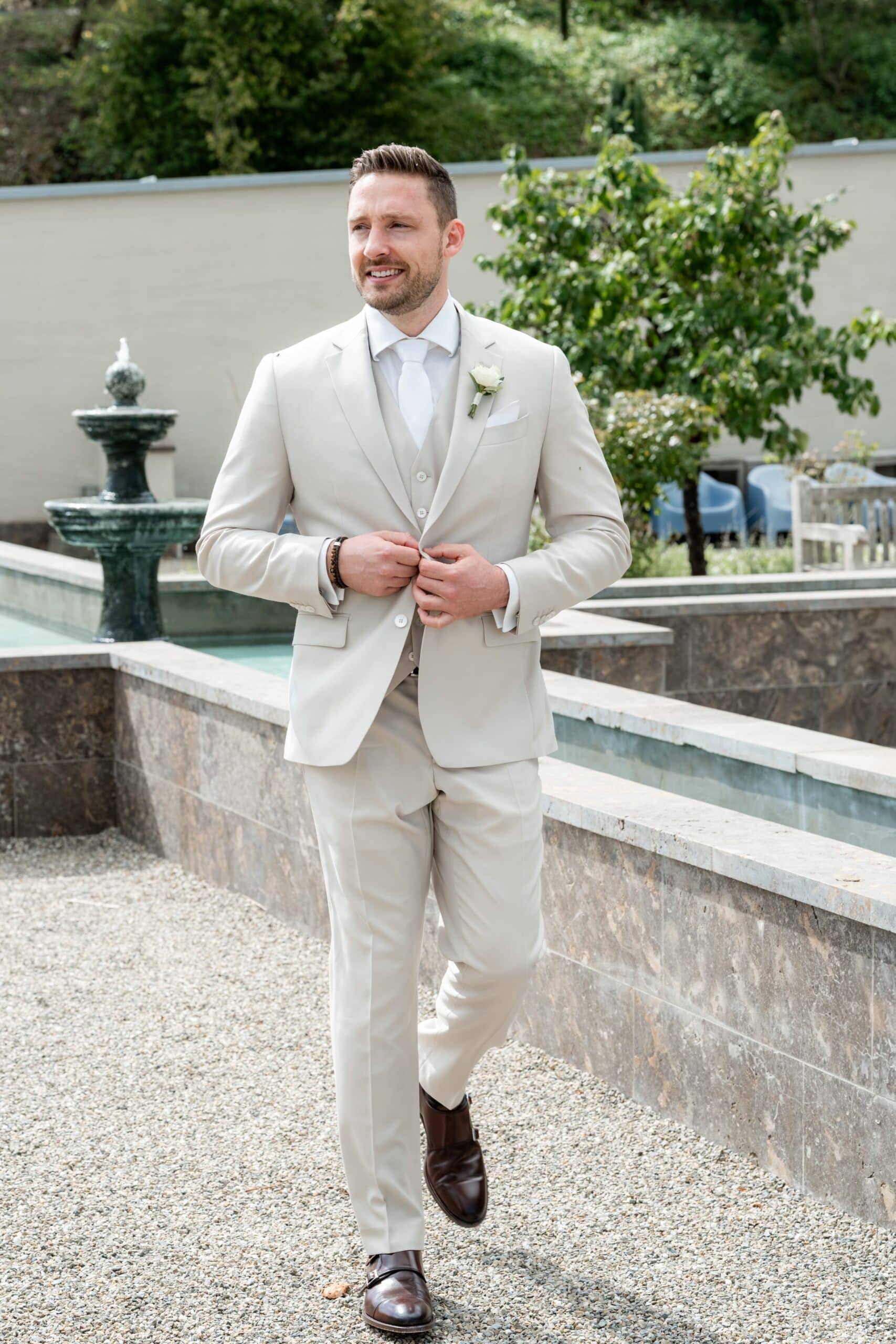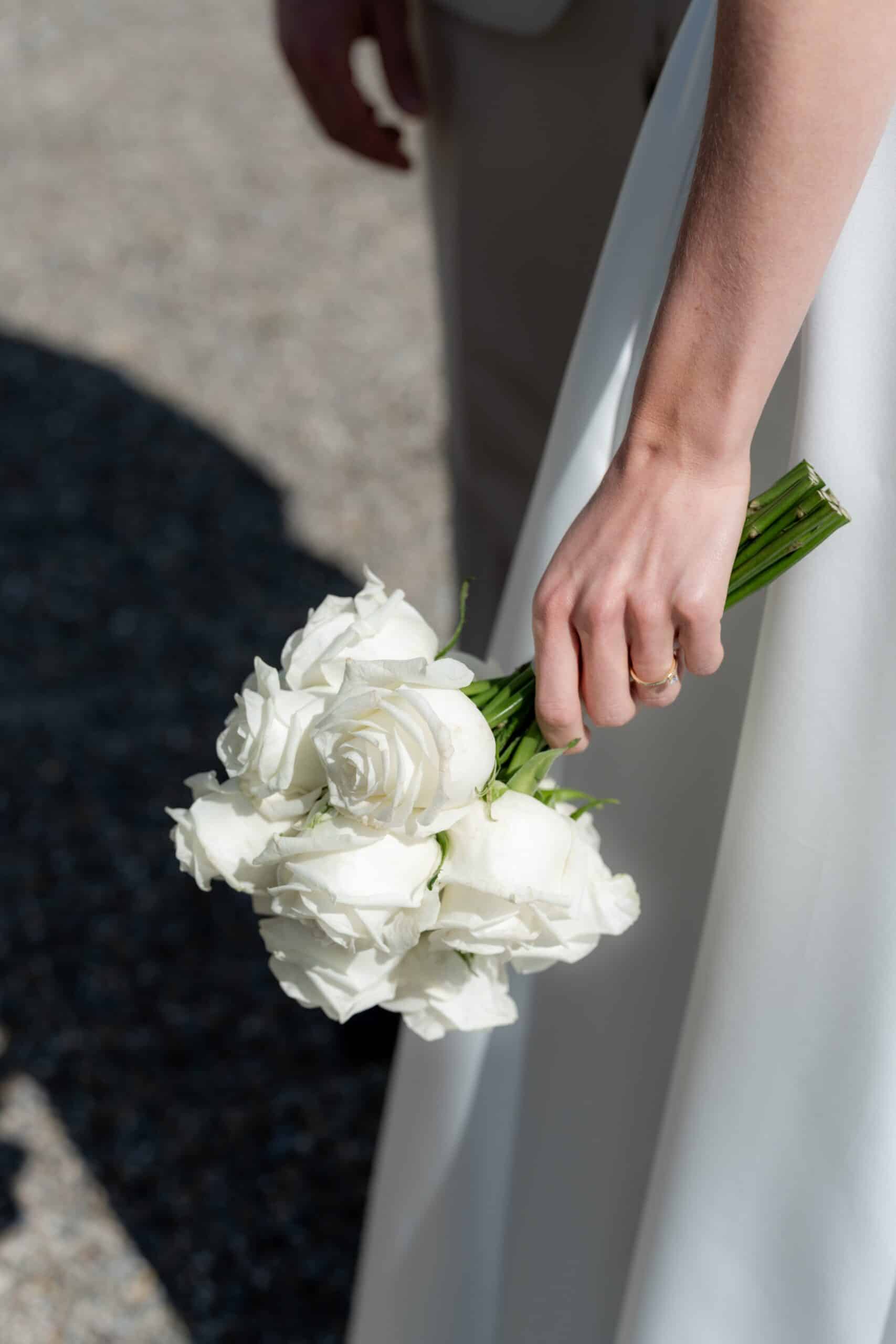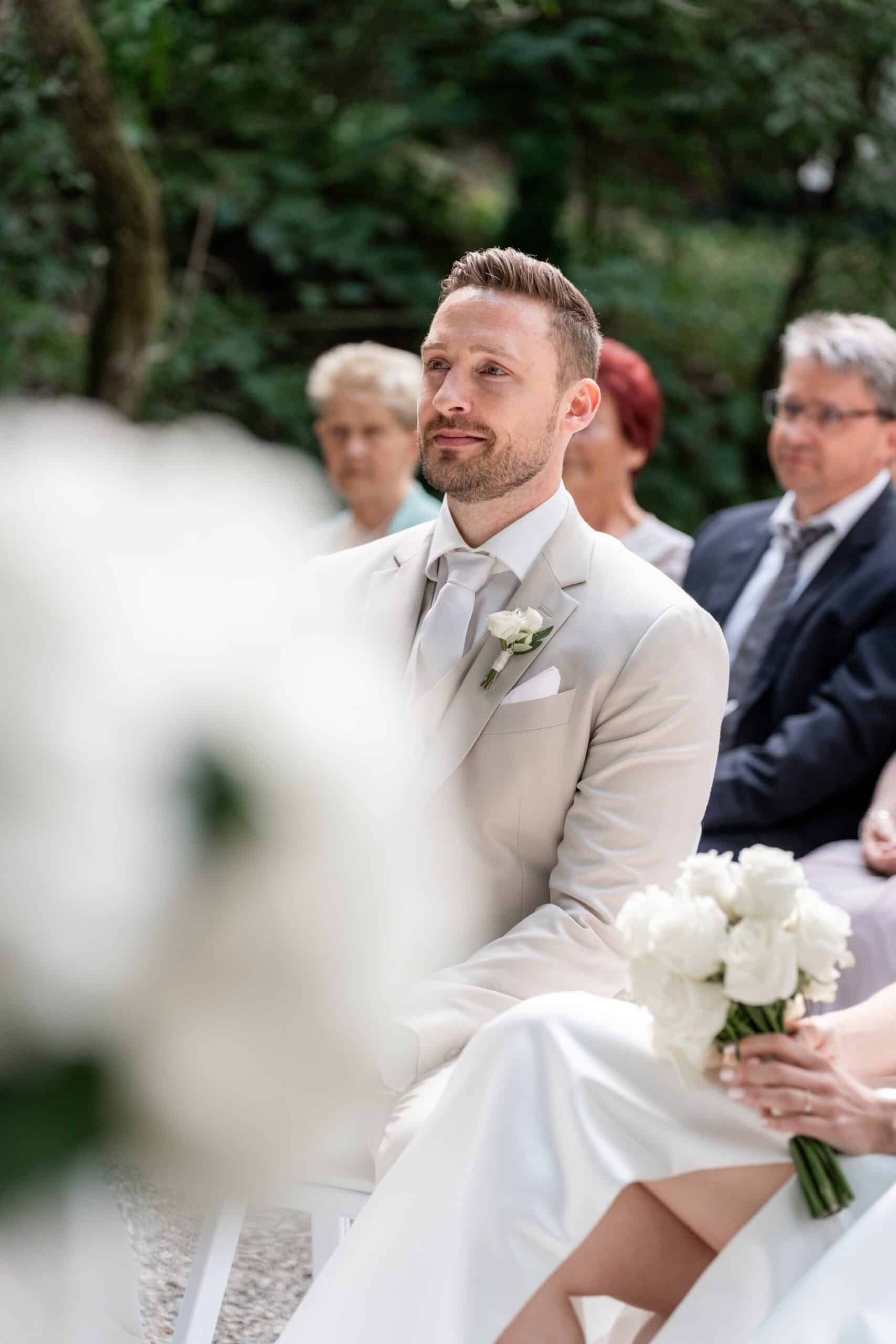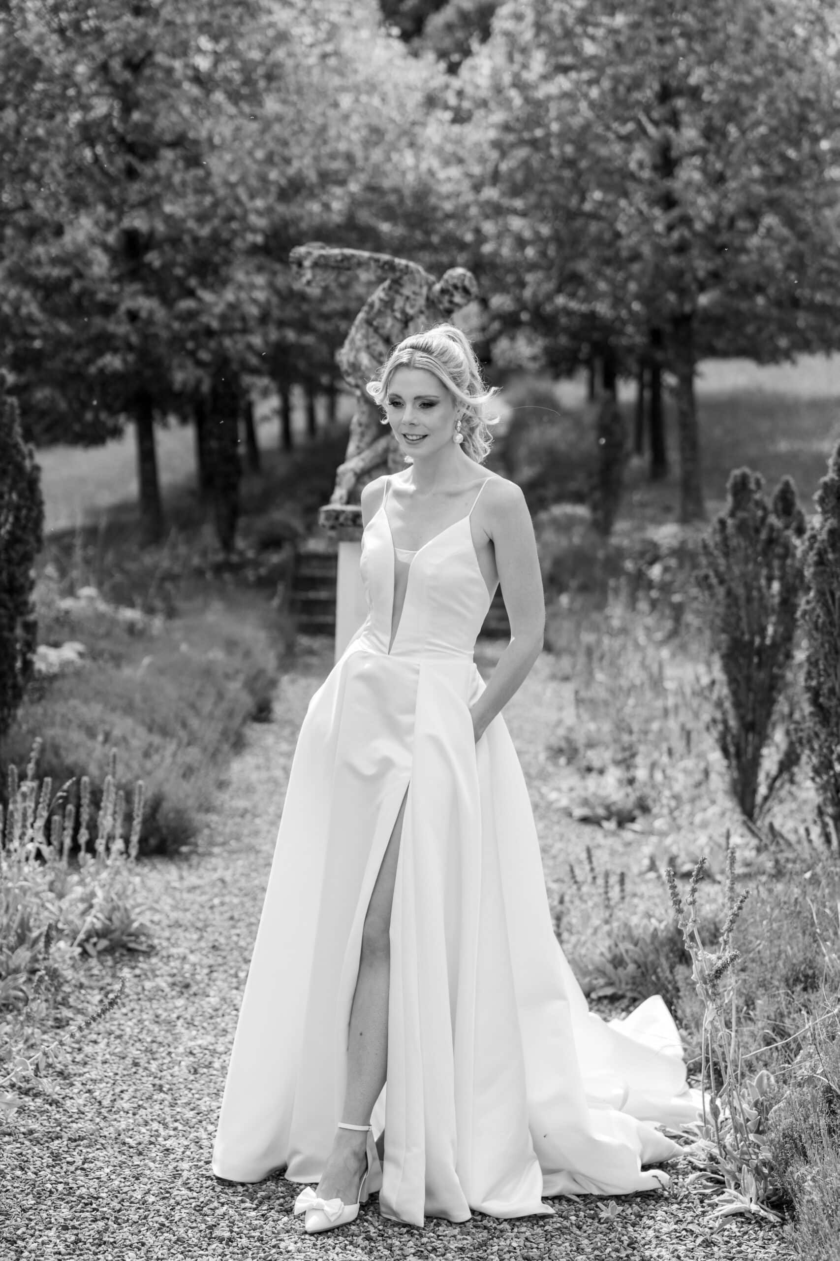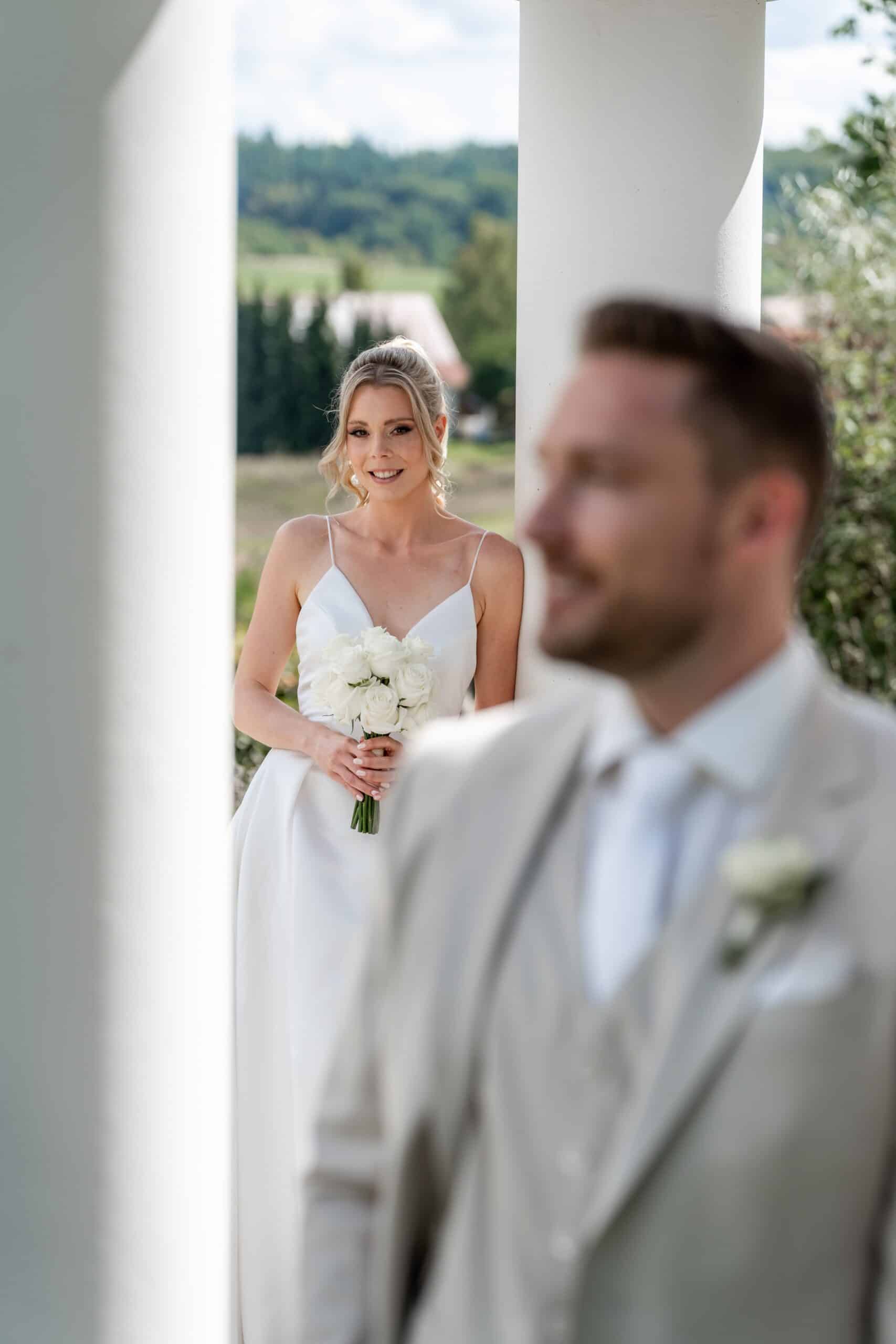 Die Villa mit ihren hellen Terrassen warmen Farben und dem offenen Garten passte perfekt zu ihrem Stil. Alles war in weichen Weißtönen gehalten von den Blumen über die Tischdekoration bis zu Pias modernem Kleid das im warmen Licht wunderschön zur Geltung kam. Dazu kam ein klarer moderner Editorial Look der dem Tag eine besondere Ästhetik gegeben hat ohne künstlich oder gestellt zu wirken.
