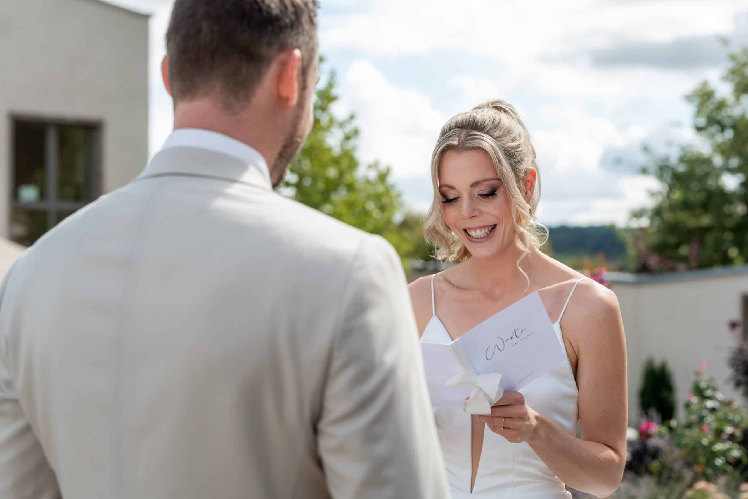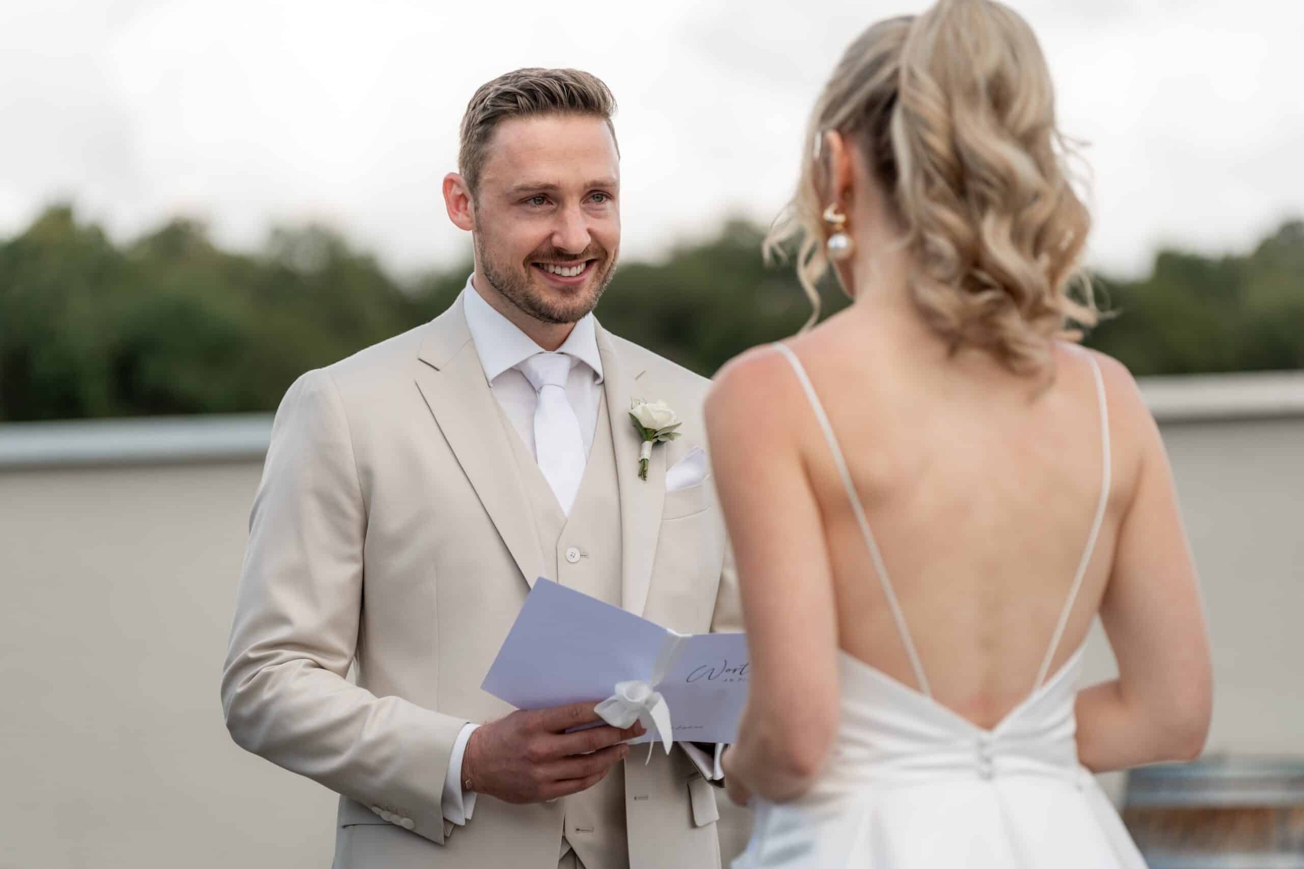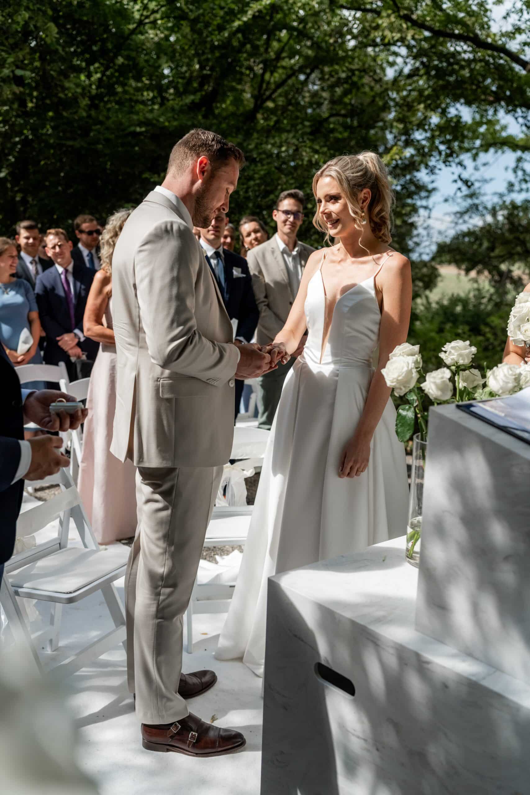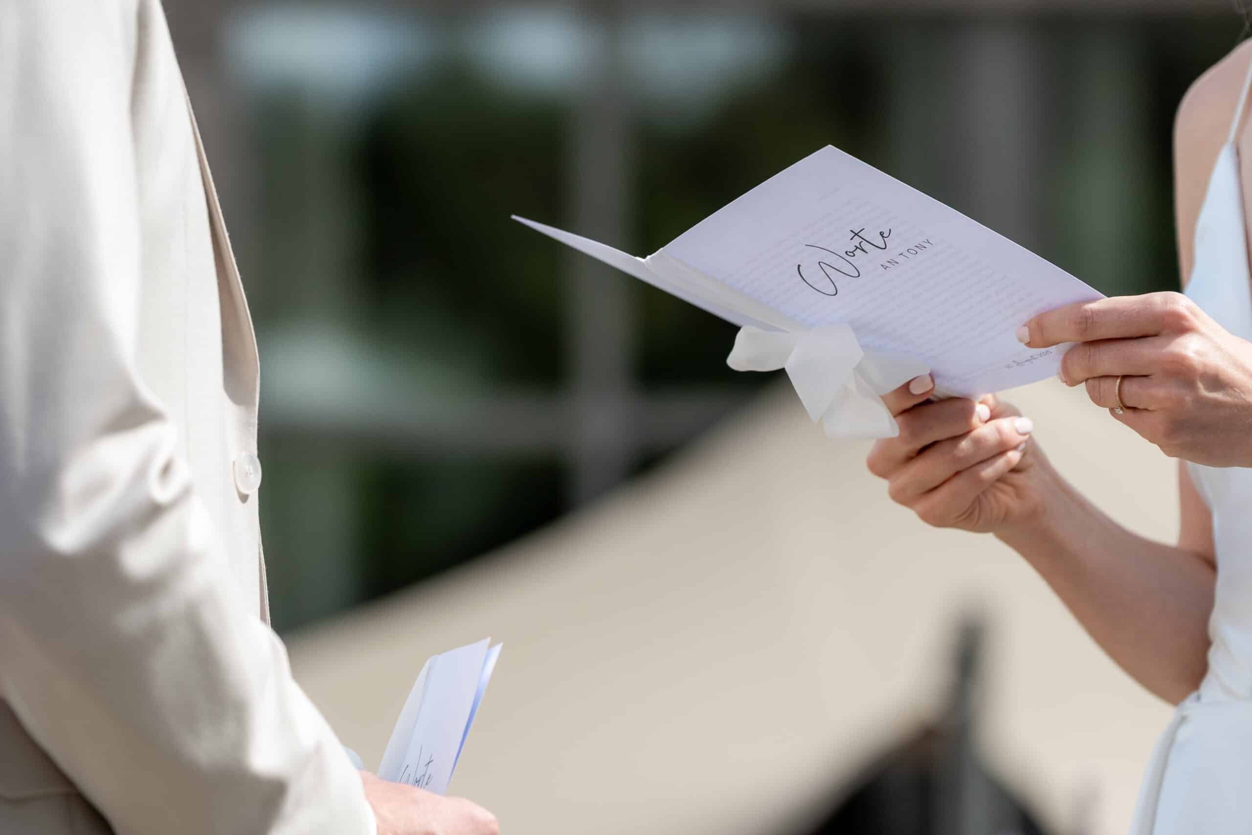 Ihre Trauung fand im Freien statt begleitet von emotionaler Musik und einem sehr persönlichen First Look bei dem sie sich gegenseitig ihre Gelübde vorgelesen haben.