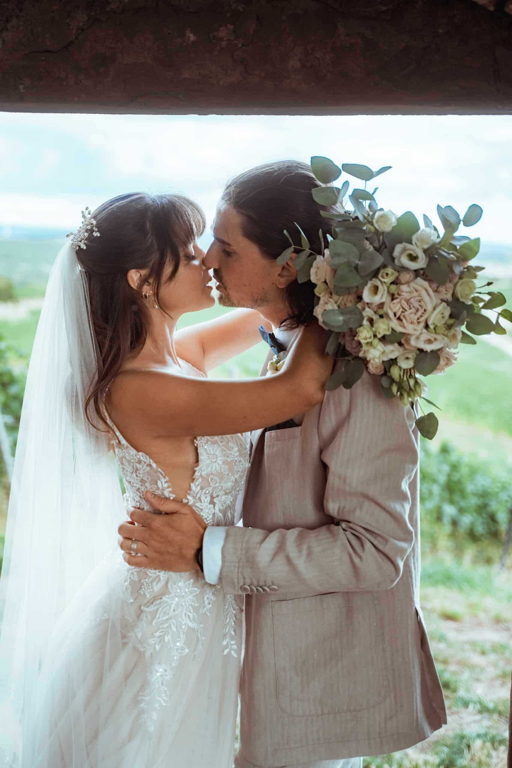 Für das Paarshooting sind wir einfach ein paar Schritte in die umliegenden Weinberge gegangen. Wir brauchten keine aufwendige Inszenierung, denn die Kulisse und das Licht am späten Nachmittag haben die Arbeit fast von alleine gemacht.