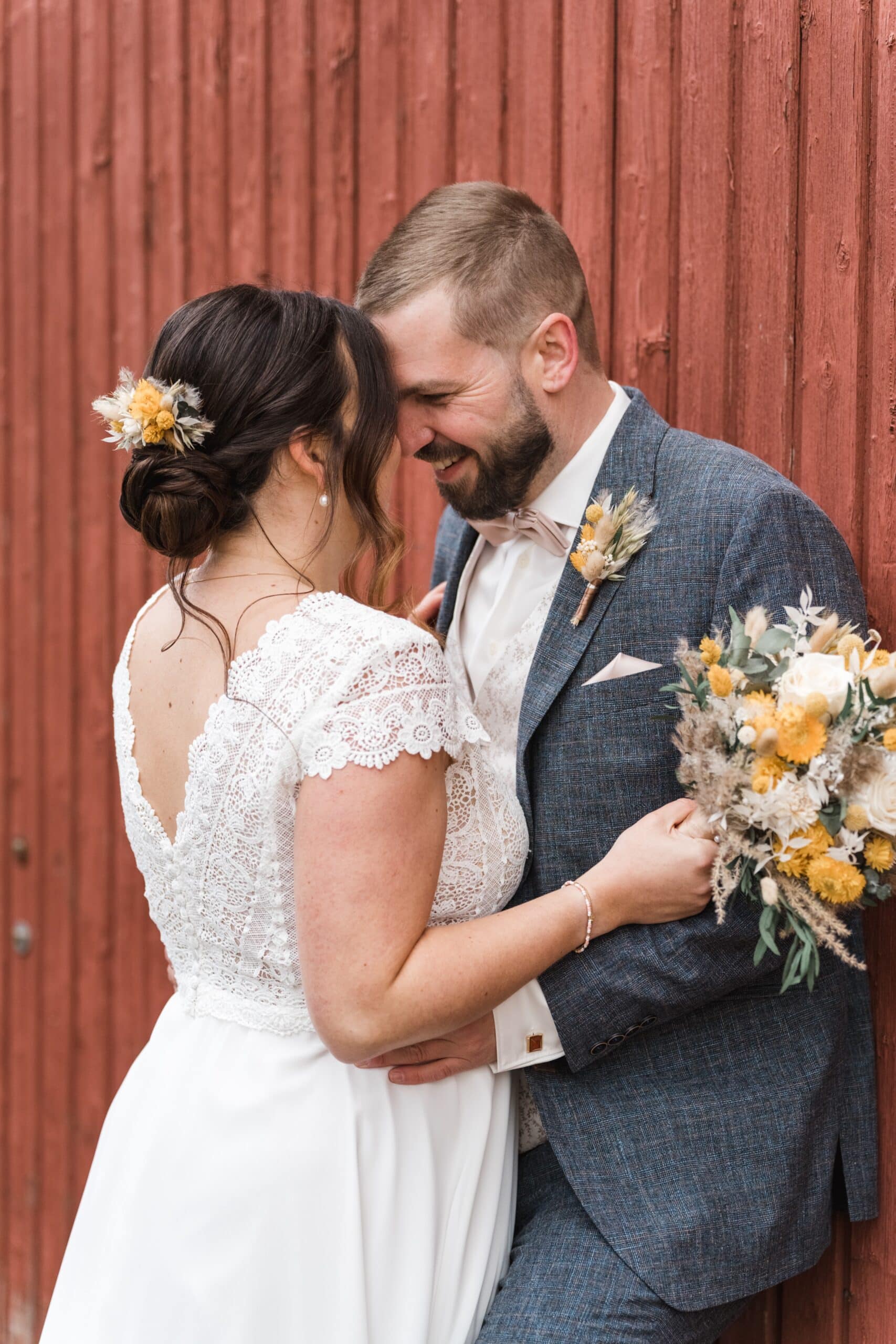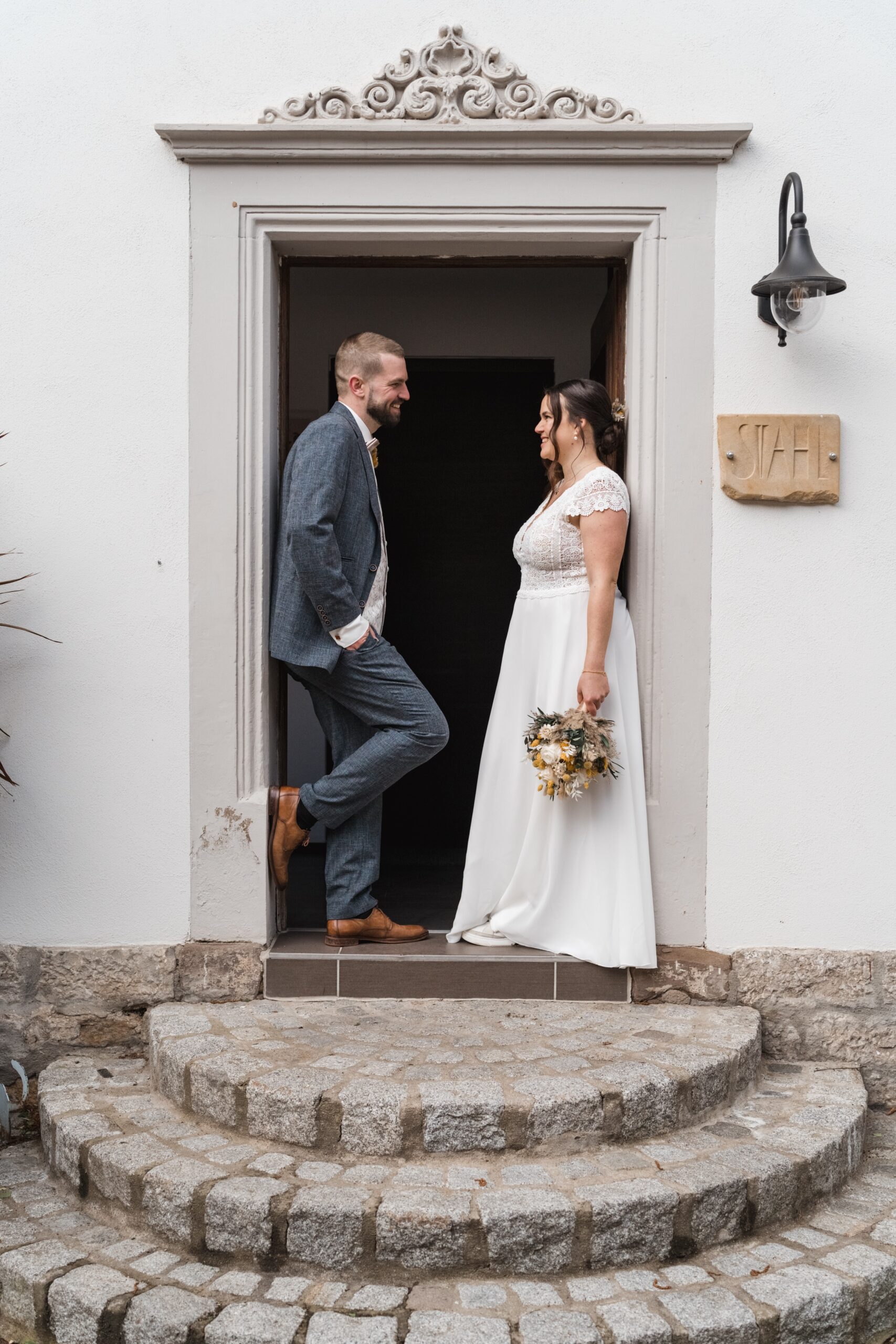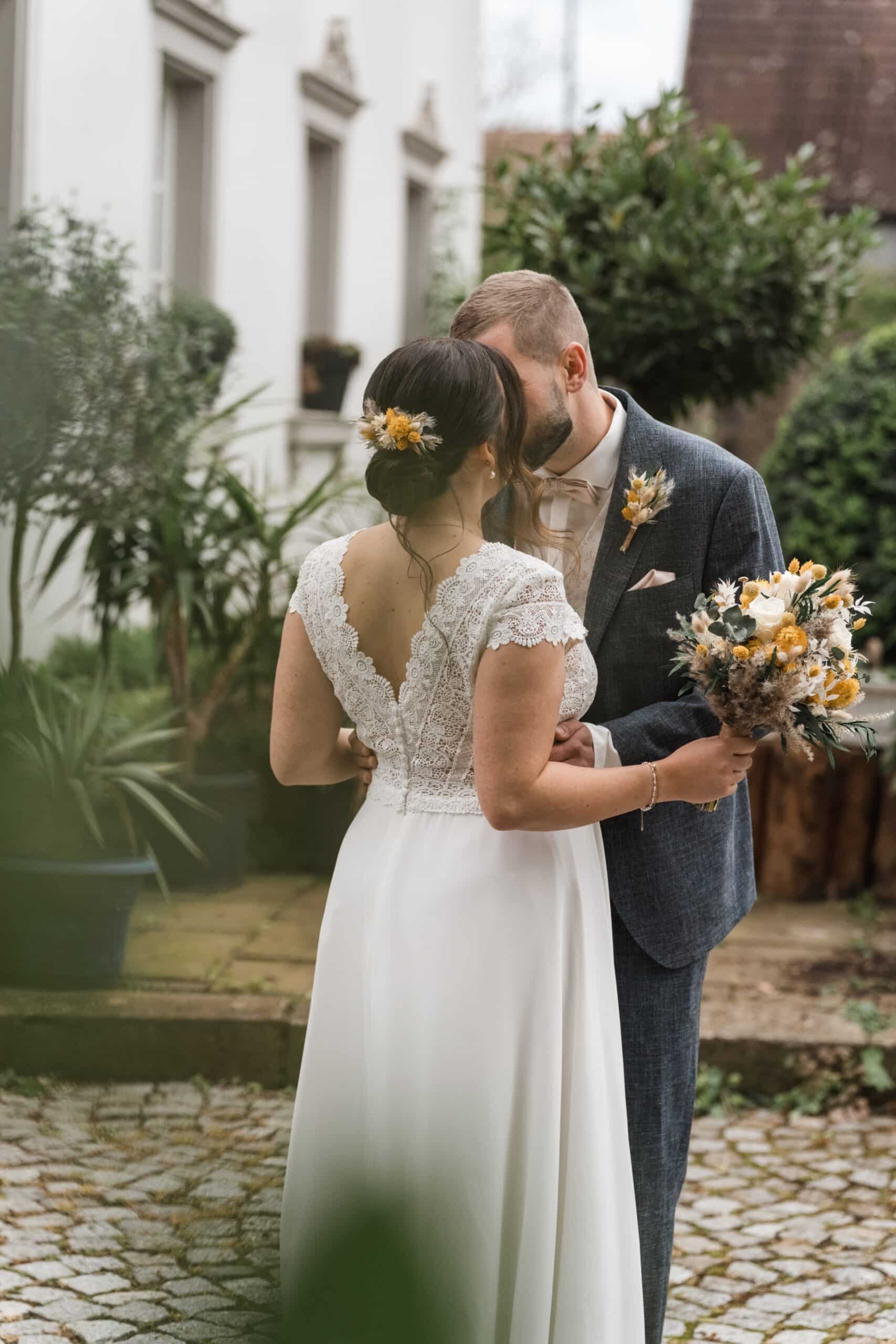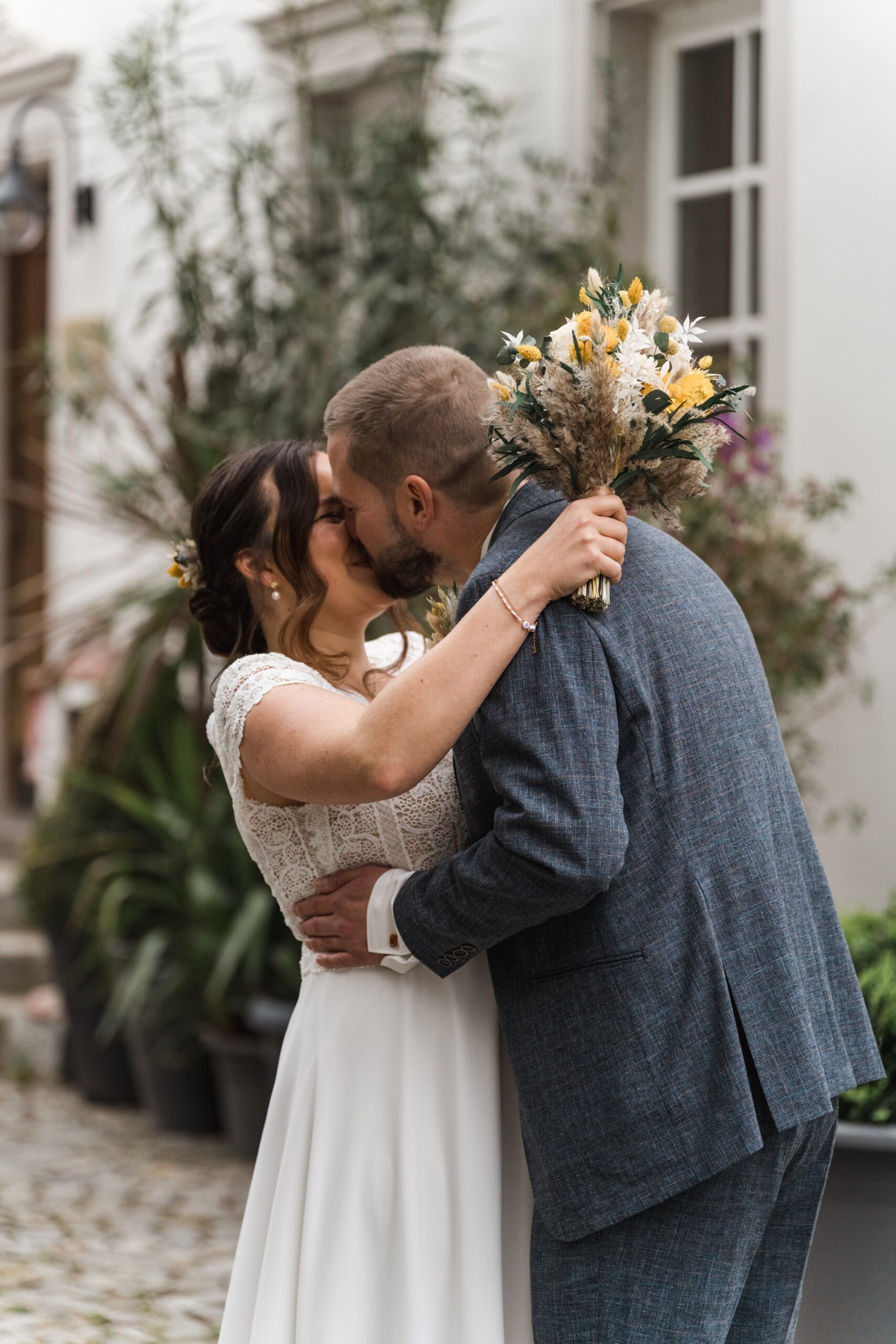 Der Tag startete mit einem First Look direkt auf dem Gelände des Winzerhofs. Da das Wetter zu Beginn noch stabil war konnten sich die Gäste entspannt draußen aufhalten was eine sehr schöne und lockere Atmosphäre geschaffen hat. Wir haben diese trockene Phase auch direkt für das Paarshooting genutzt bevor das Wetter umschlug.