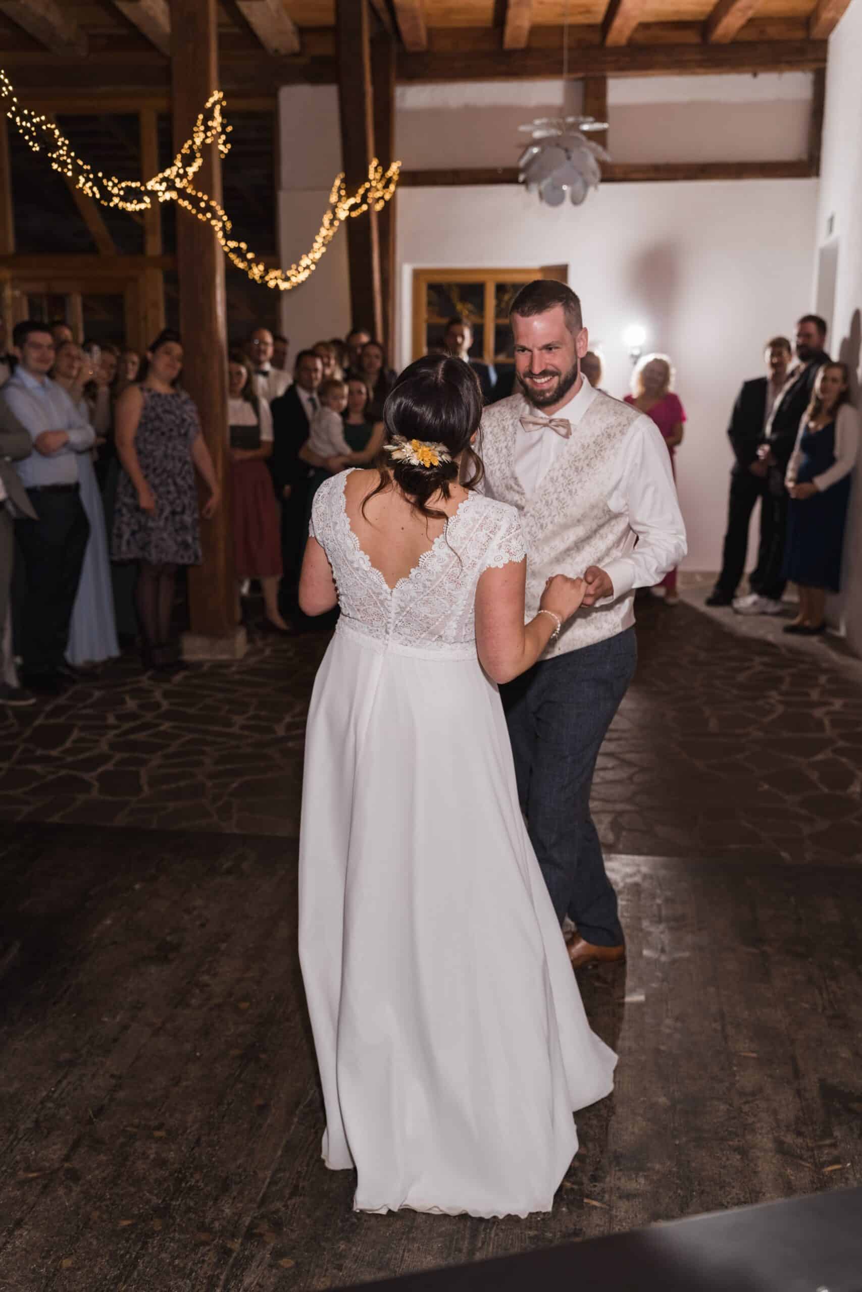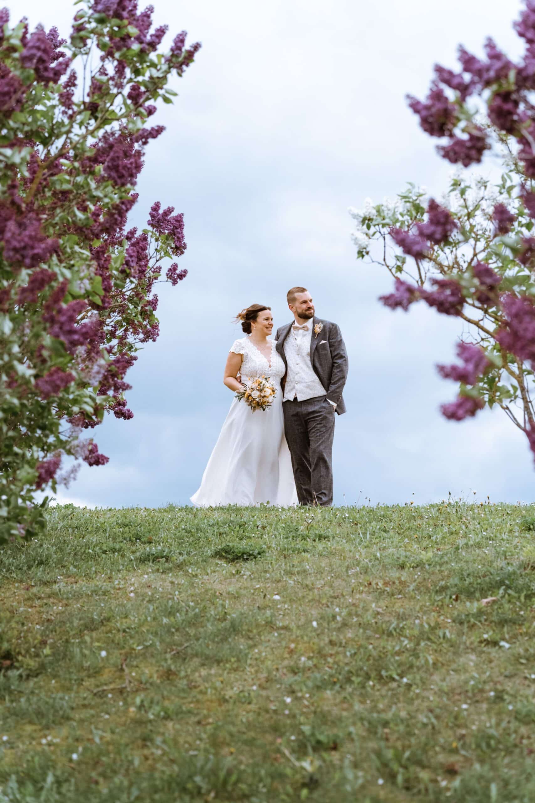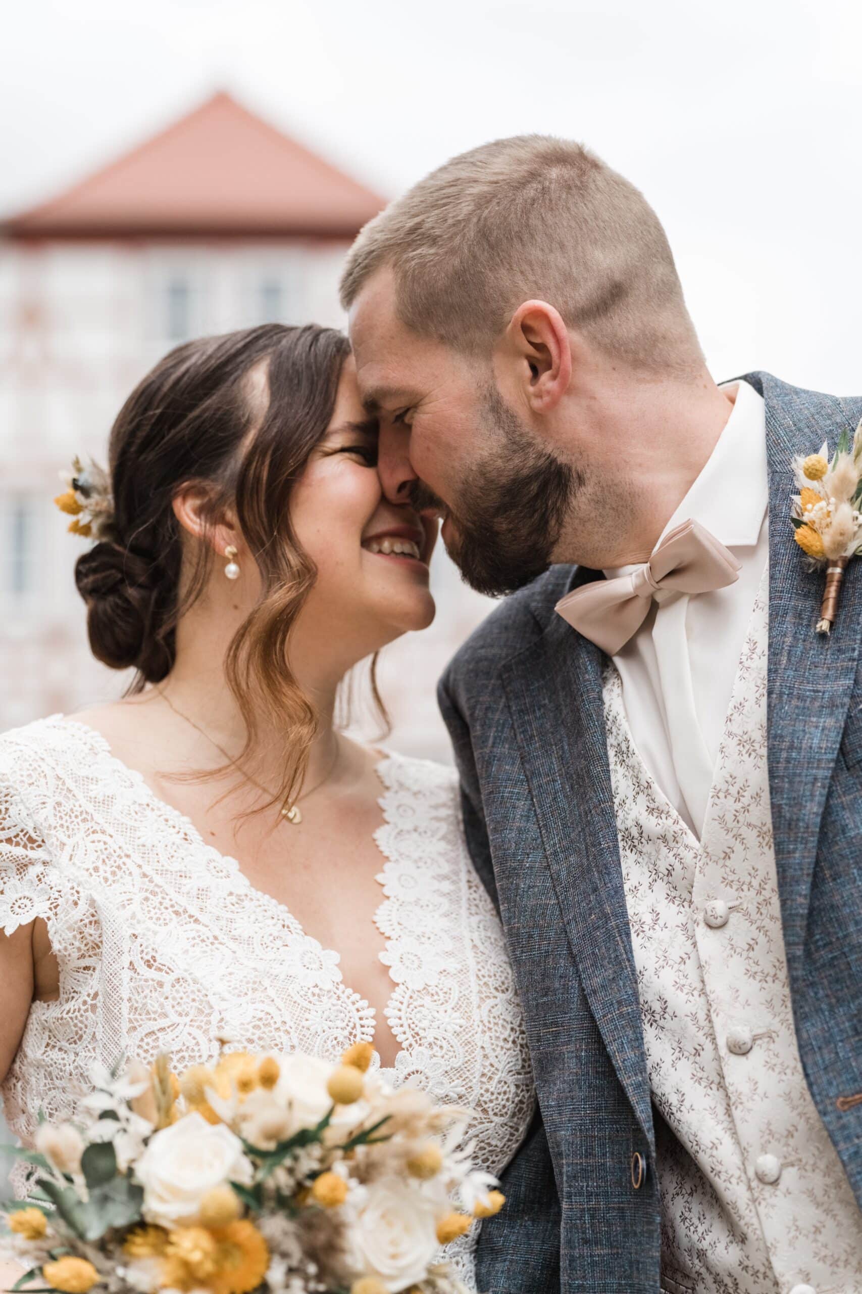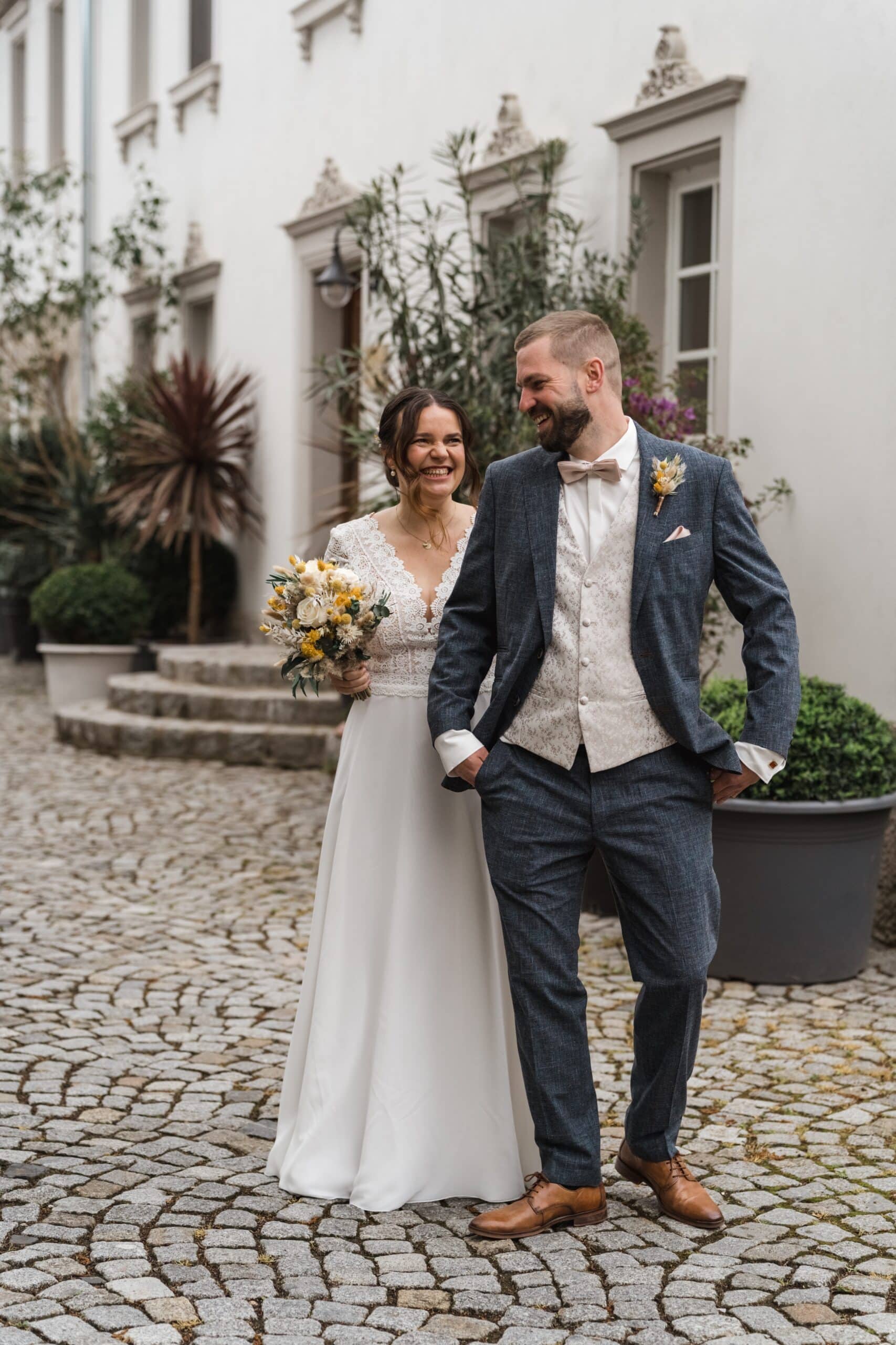 Der Tag startete mit einem First Look direkt auf dem Gelände des Winzerhofs. Da das Wetter zu Beginn noch stabil war konnten sich die Gäste entspannt draußen aufhalten was eine sehr schöne und lockere Atmosphäre geschaffen hat. Wir haben diese trockene Phase auch direkt für das Paarshooting genutzt bevor das Wetter umschlug.